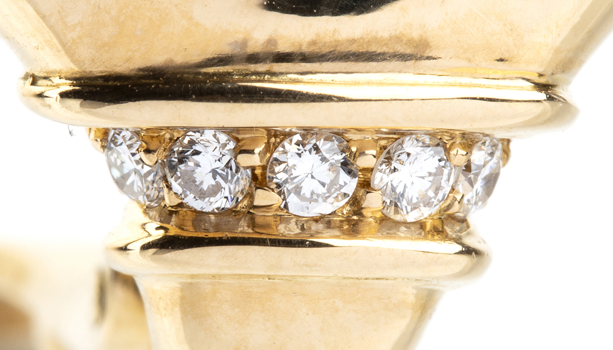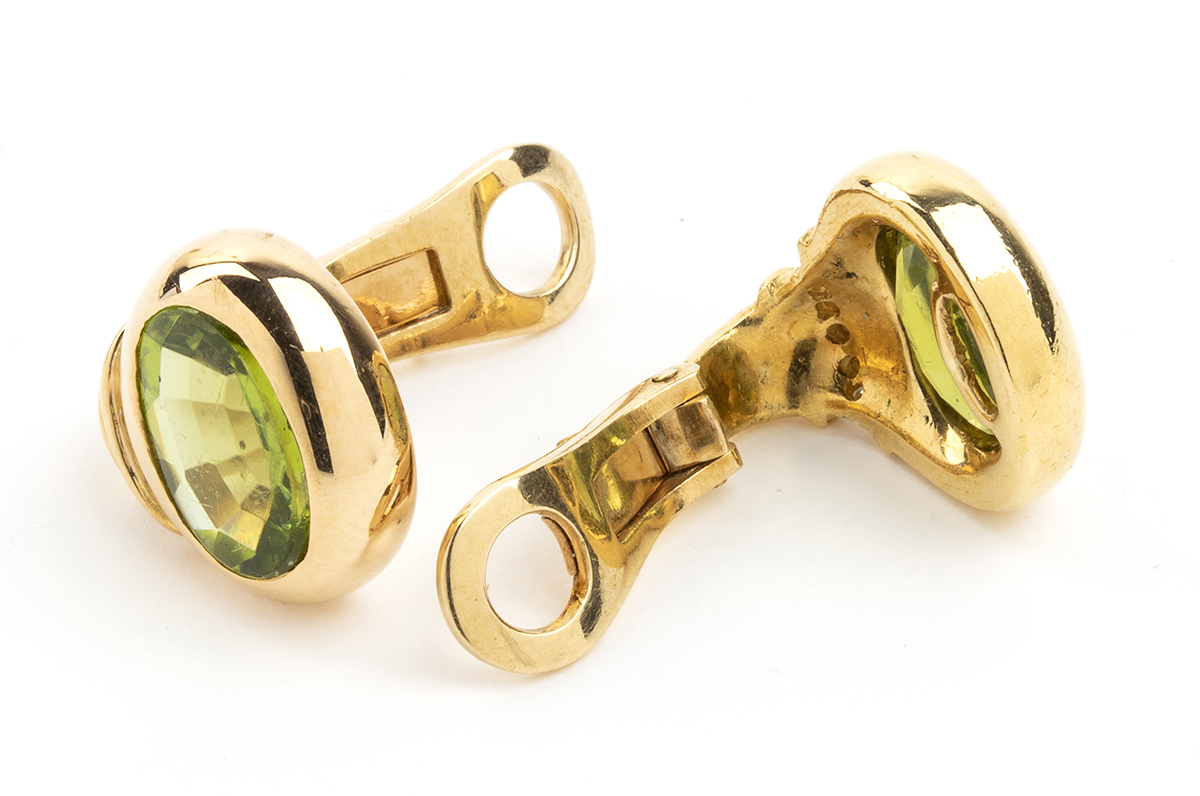 oro giallo 18k, incastonati con peridoto e dettagli in diamanti taglio brillante 0,15 ct circa, E-F, IF-VVS. Punzonato "BVLGARI - 750 - 150 ROMA".