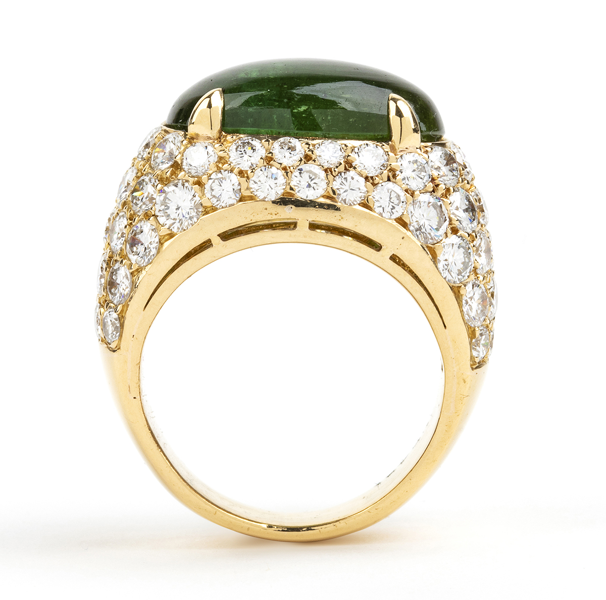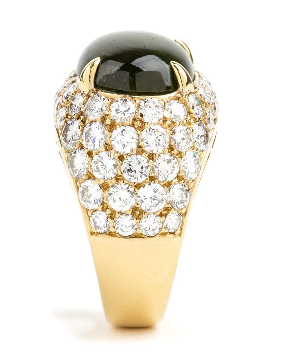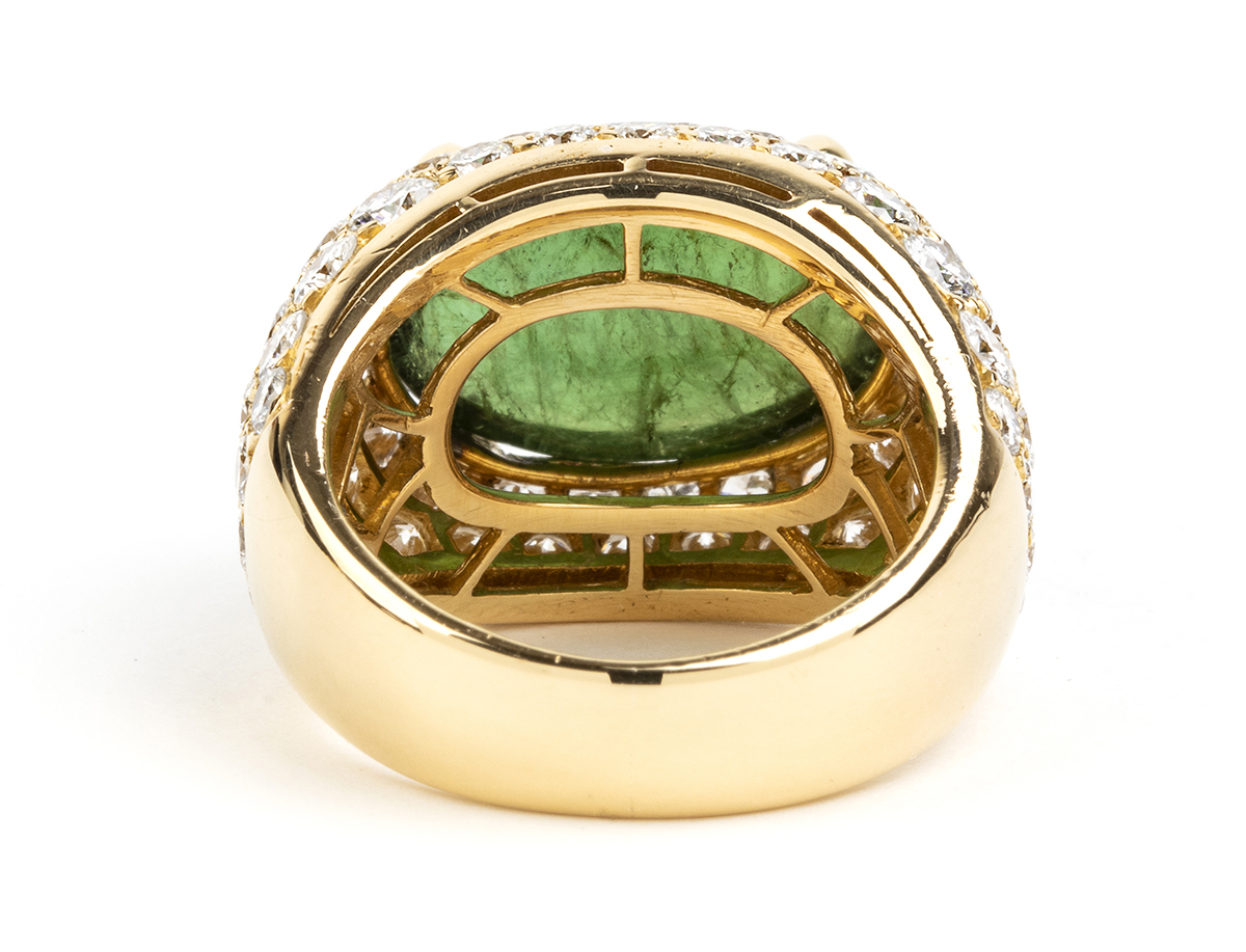 oro giallo 18k, modellato come una fascia, incastonato con cabochon di tormalina verde contornata da pavé di diamanti taglio brillante 3,30 ct circa, F-G, IF-VVS. Firmato BVLGARI.