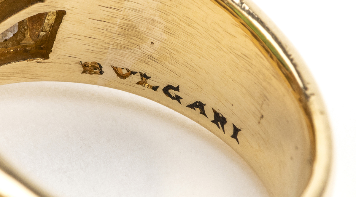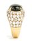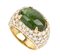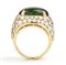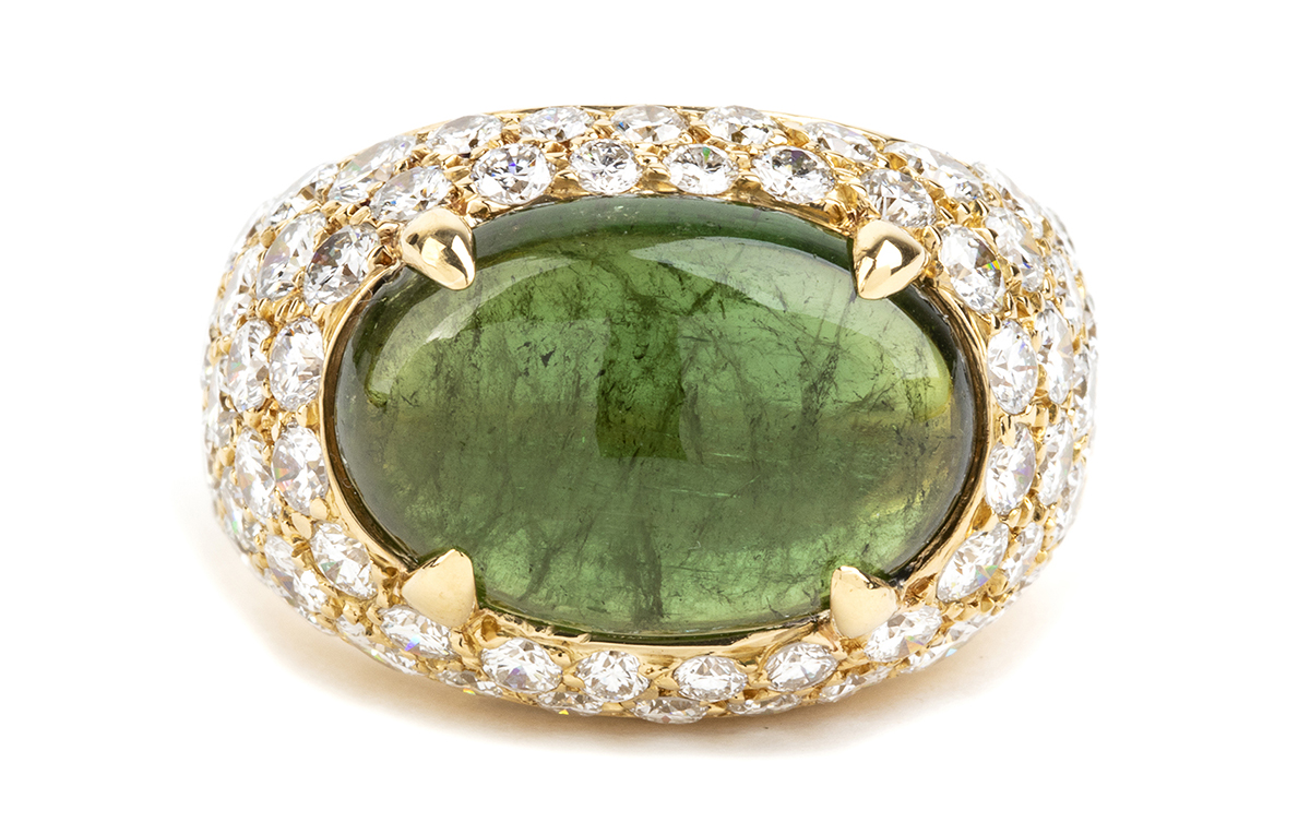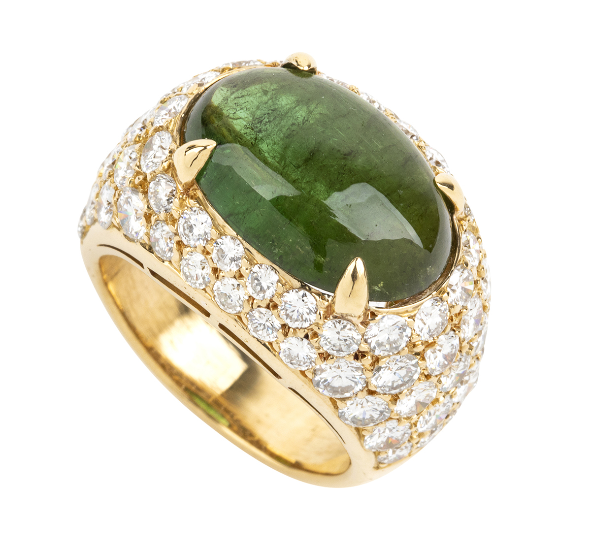 oro giallo 18k, modellato come una fascia, incastonato con cabochon di tormalina verde contornata da pavé di diamanti taglio brillante 3,30 ct circa, F-G, IF-VVS. Firmato BVLGARI.
