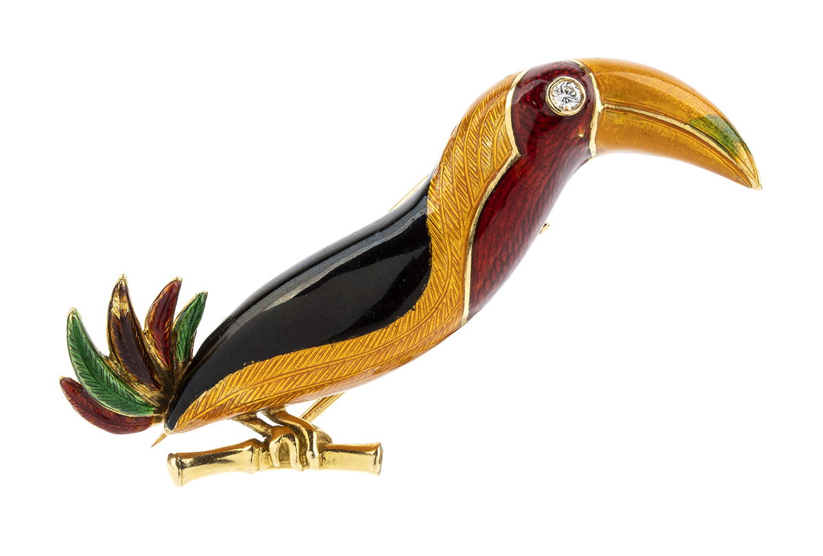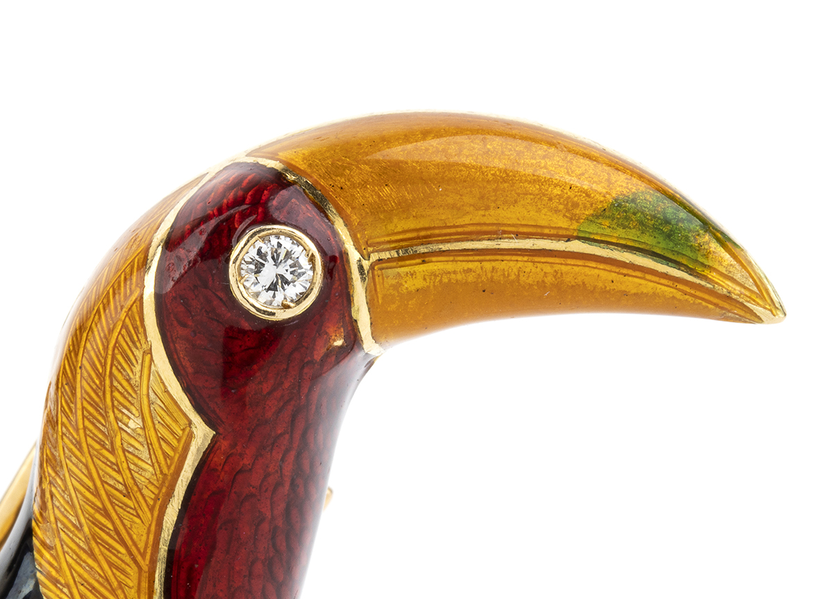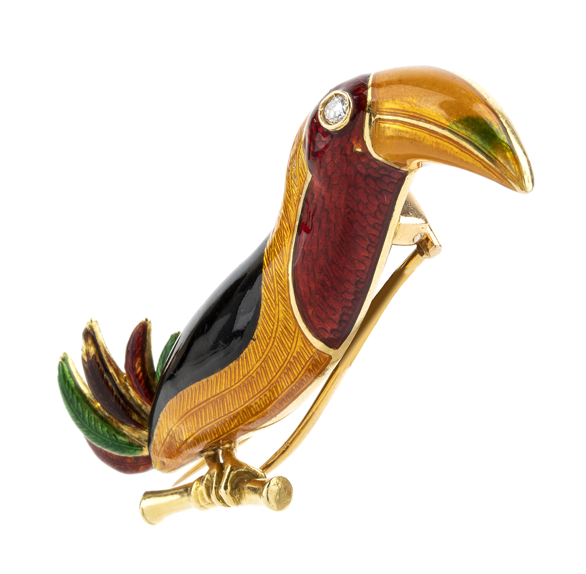 Spilla oro diamante e smalti raffigurante un tucano - firmata BULGARI, anni '80.
