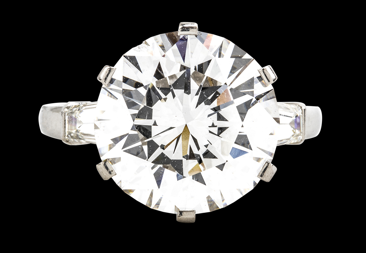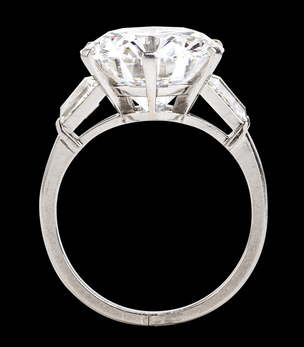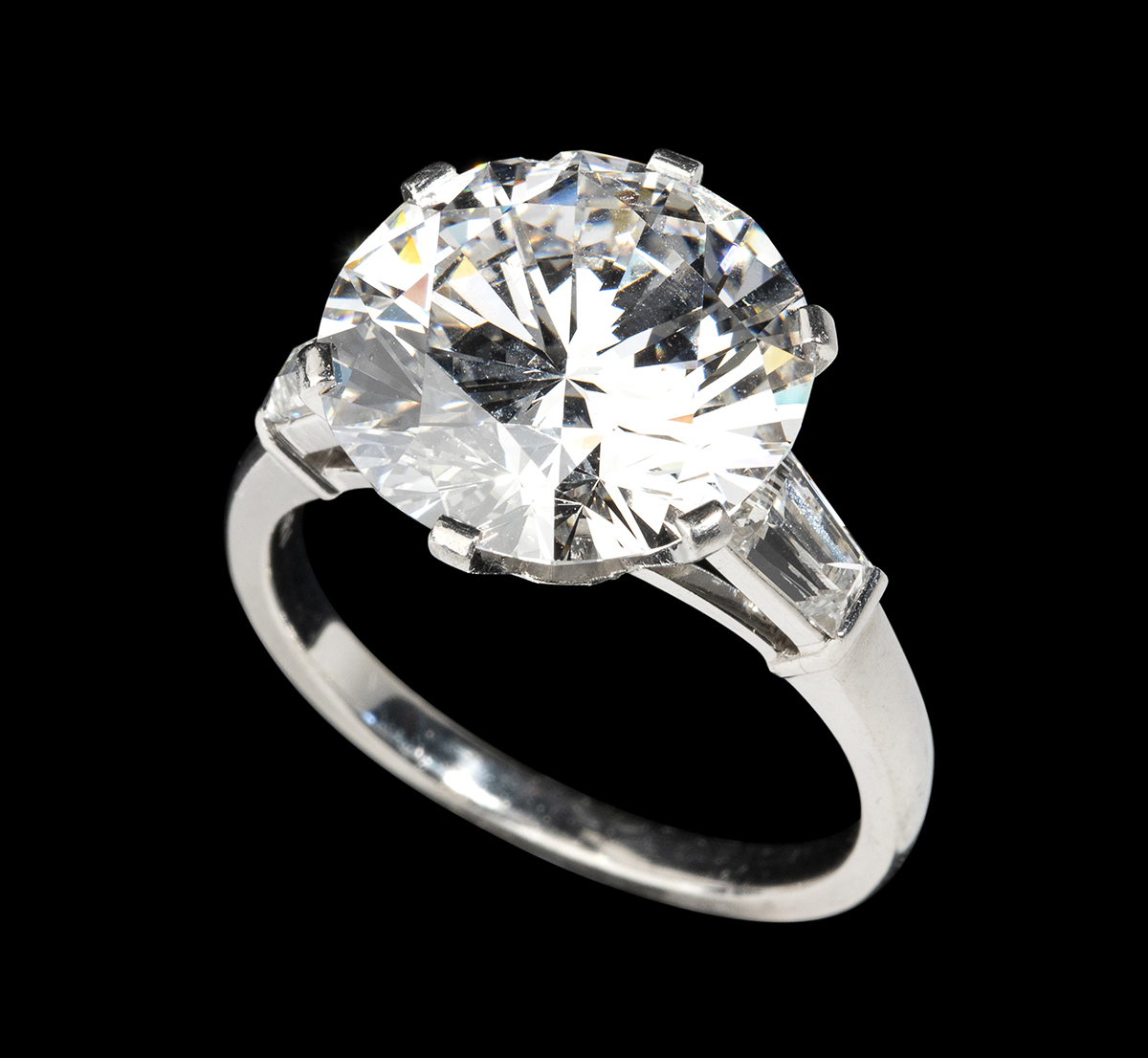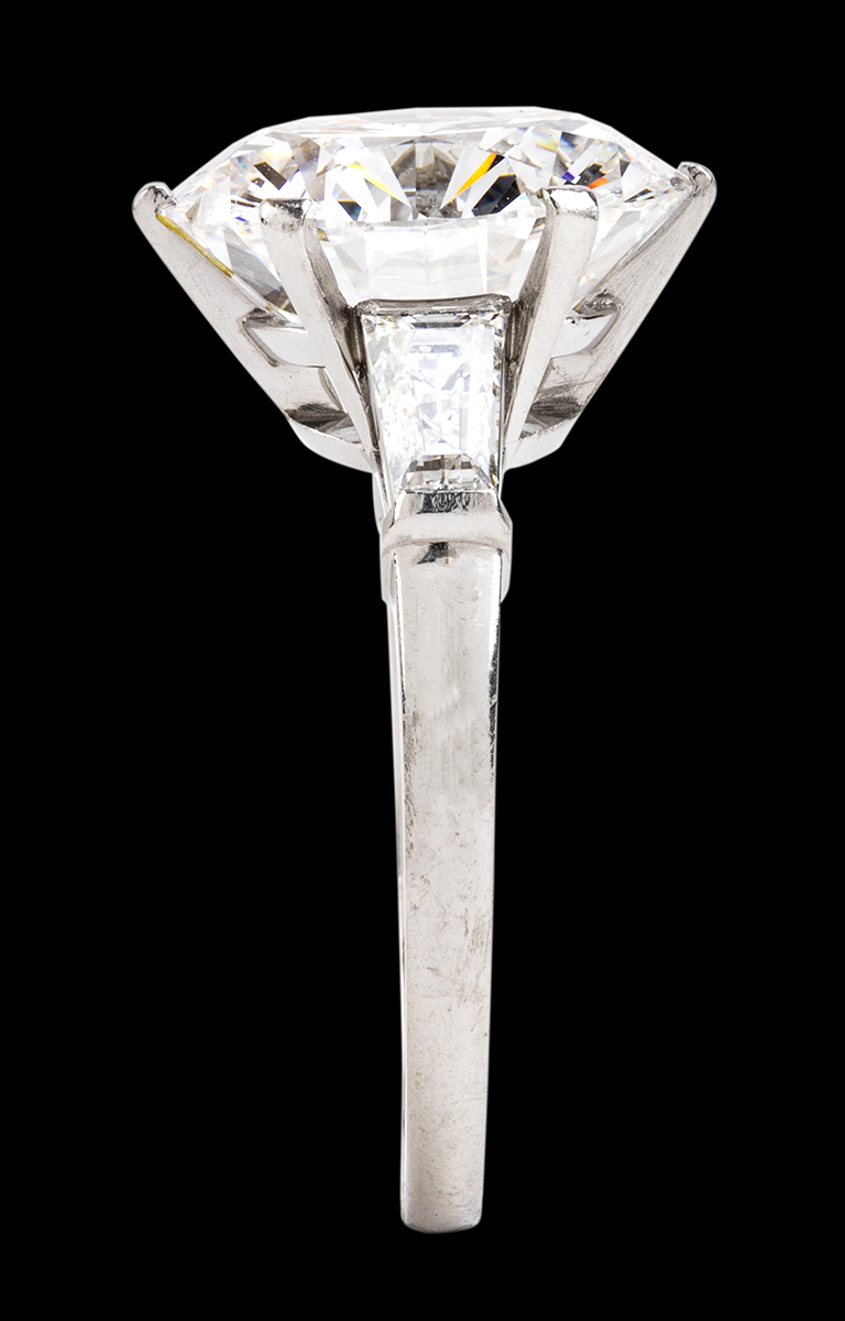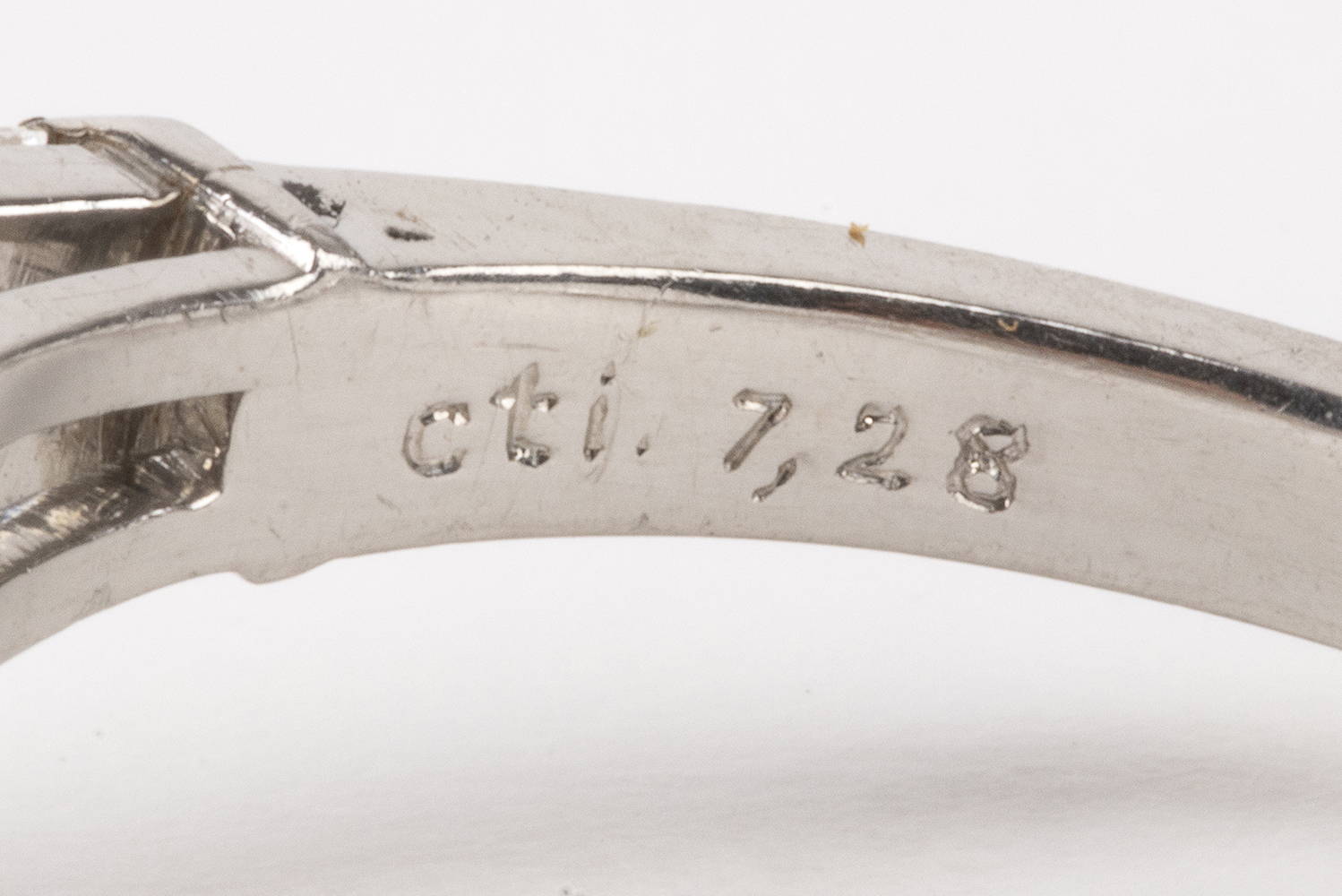 incastonato con diamante taglio brillante 7,27 ct, E, VS1, affiancato da coppia di diamanti taglio tapered per totali 0,60 ct circa, E-F, IF-VVS.