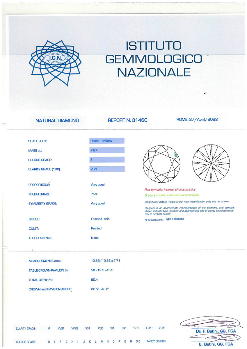 Accompagnato da certificato gemmologico IGN nr 31460, Istituto Gemmologico Nazionale.