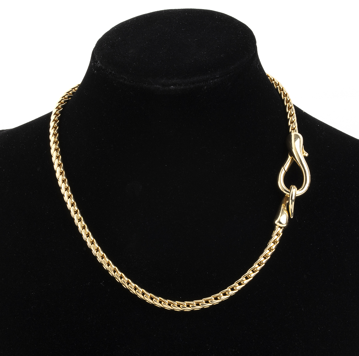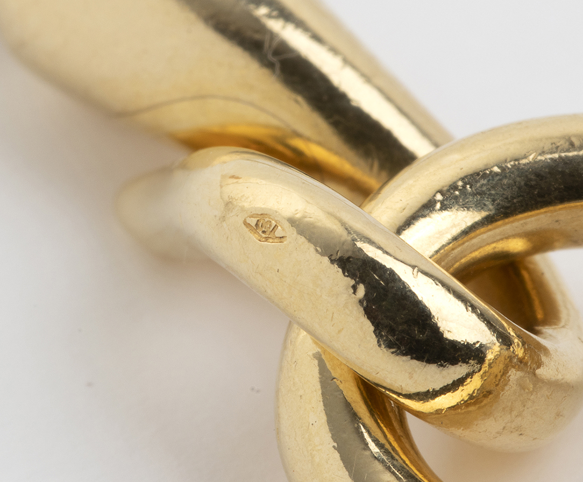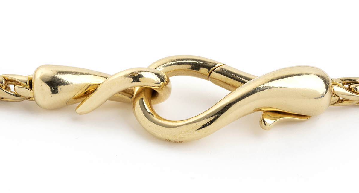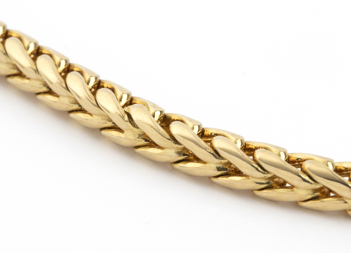 catena in maglia a spiga in oro giallo 18k. Firmato POMELLATO e punzonato "468 MI - 750". Lunghezza 40 cm circa.