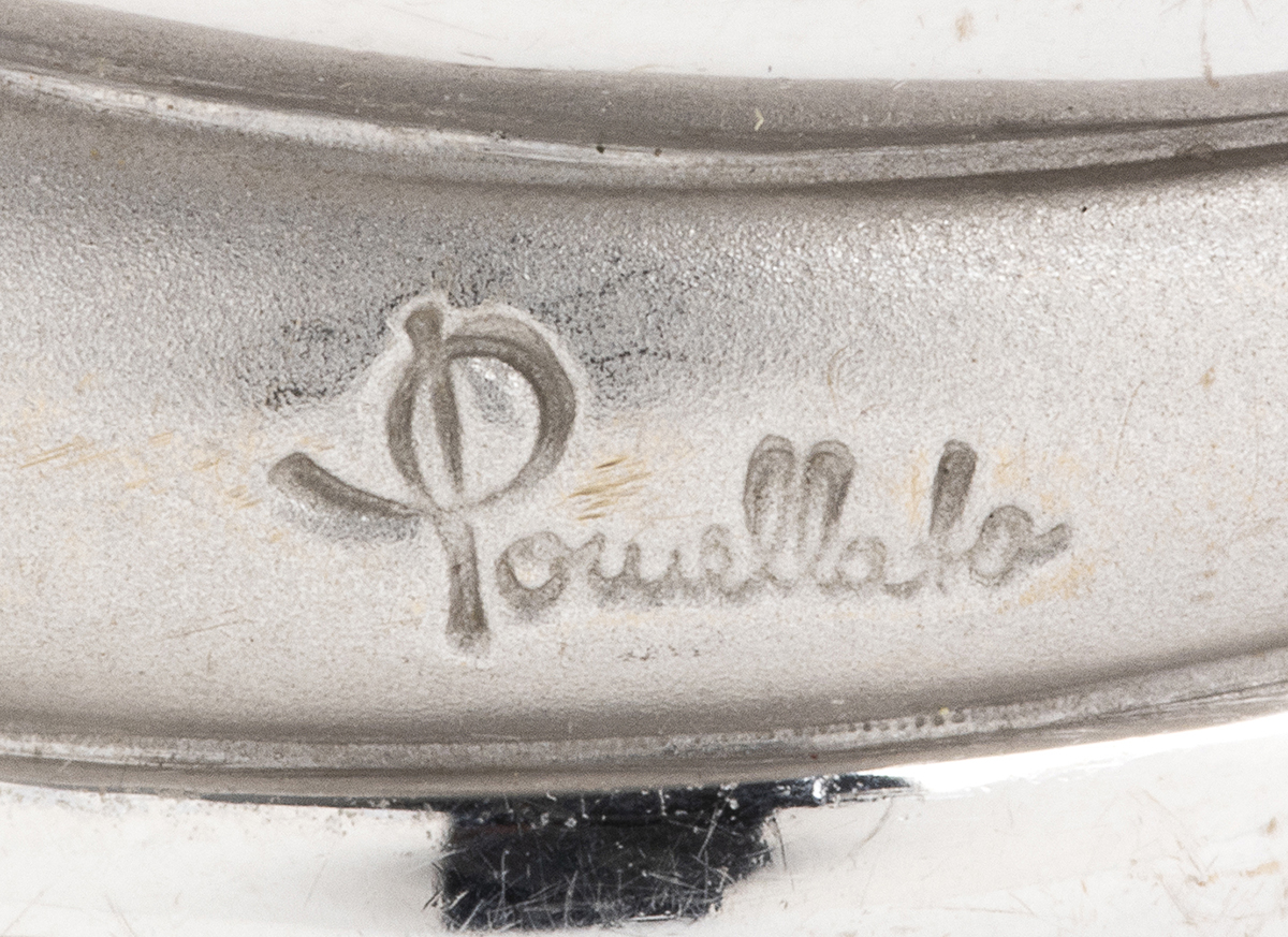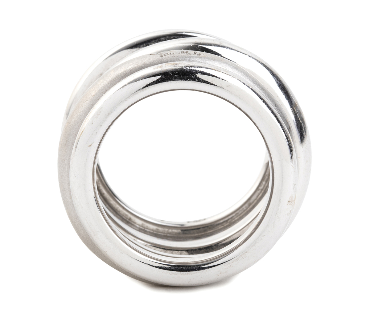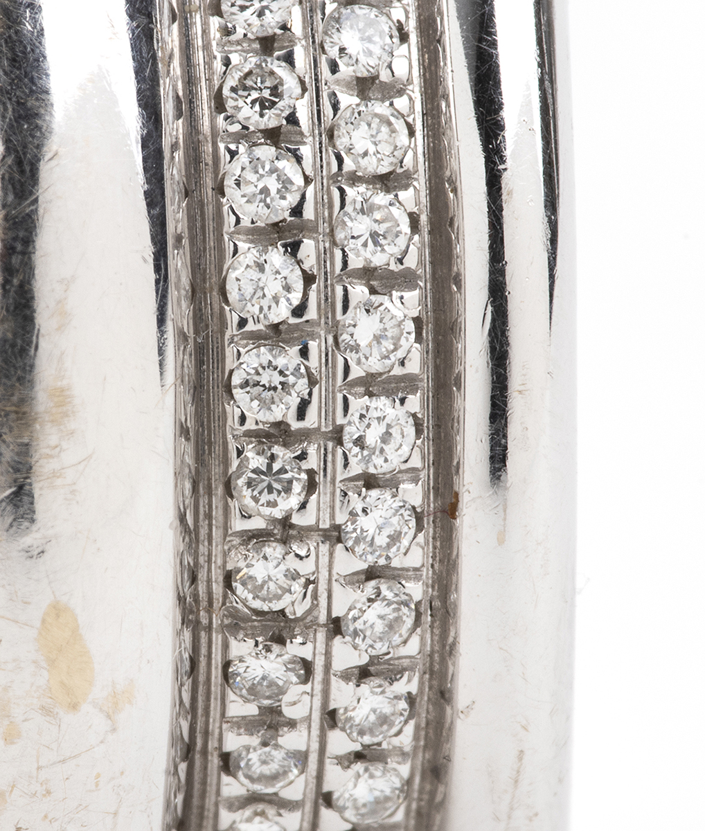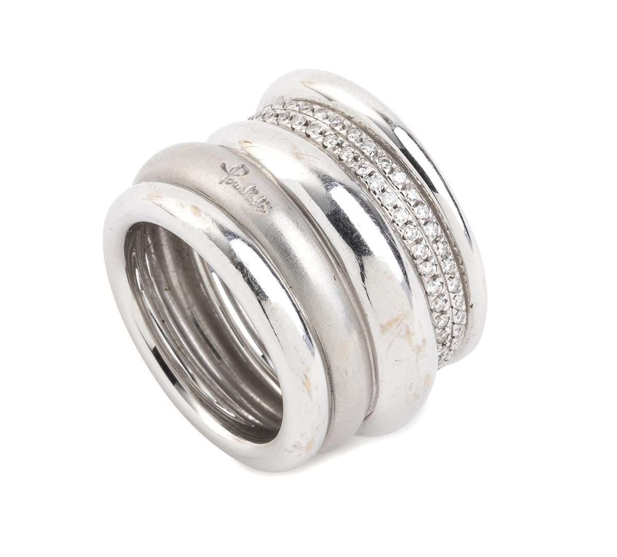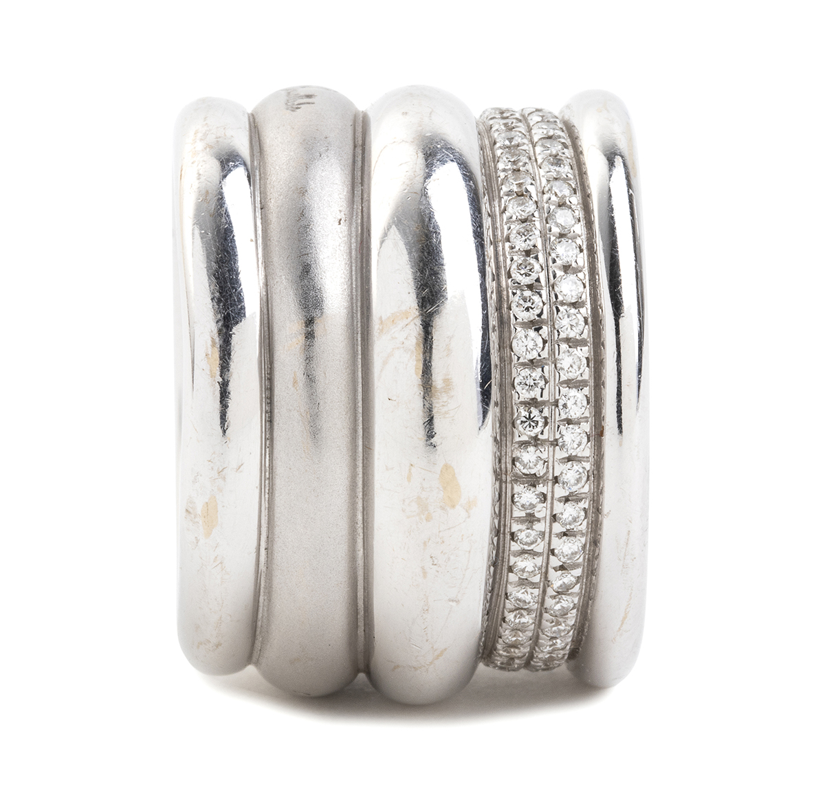 oro bianco 18k, modellato come una larga fascia in oro bianco 18k, incastonato con pavé di diamanti taglio brillante 0,60 ct circa, E-F, IF-VVS. Firmato POMELLATO e punzonato "750 - 351 MI".
