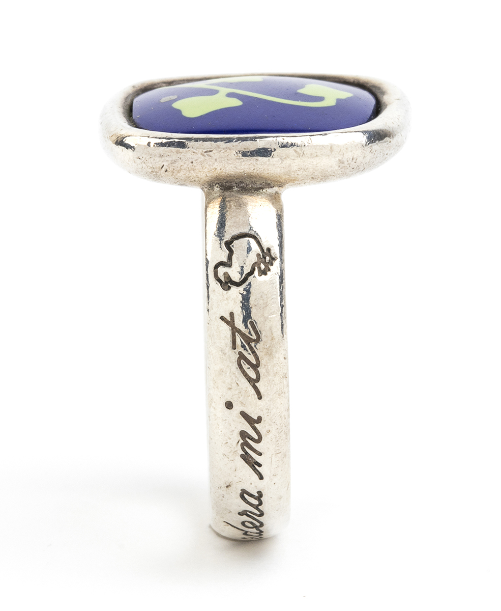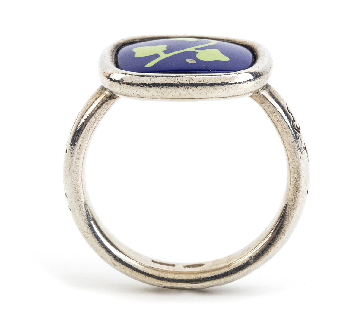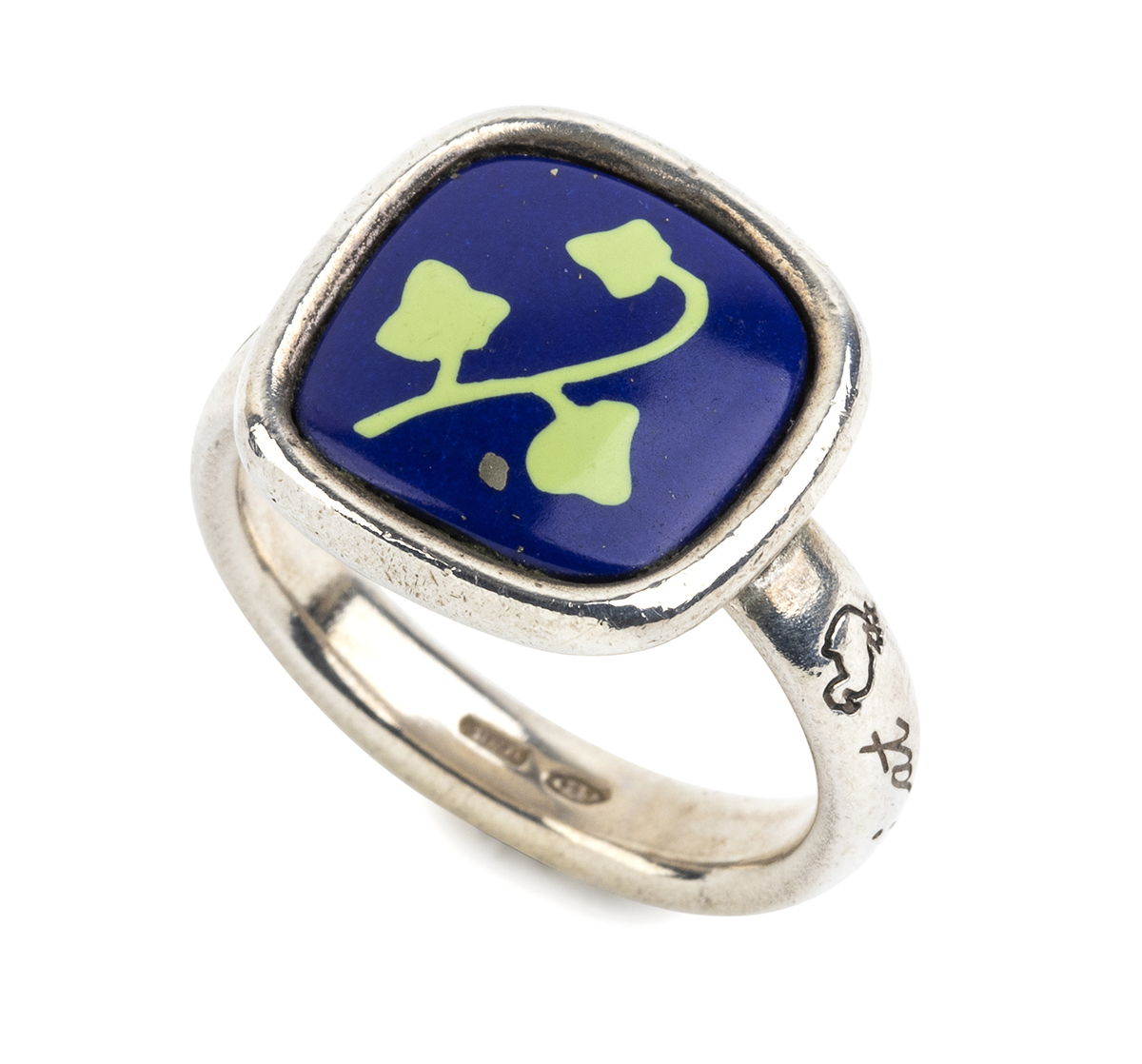 con motivo floreale in smalto giallo applicato su lapislazuli. Reca iscrizione "mi attacco come l'edera". Argento 925/1000, punzonato "1970 AL - 925".