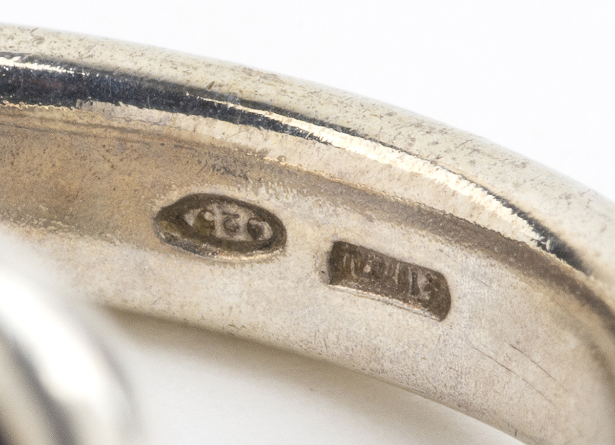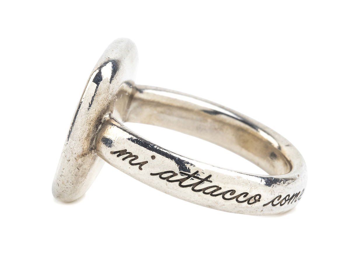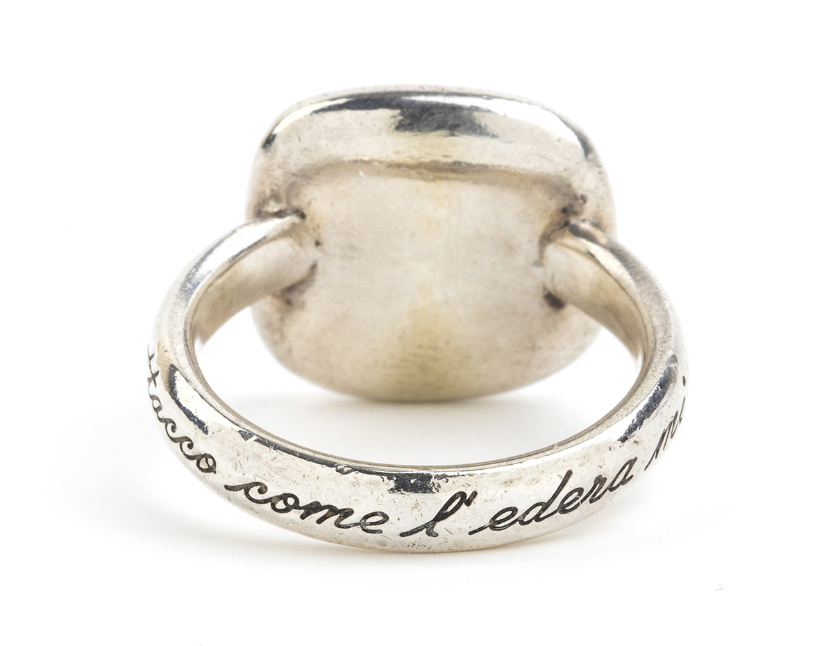 con motivo floreale in smalto giallo applicato su lapislazuli. Reca iscrizione "mi attacco come l'edera". Argento 925/1000, punzonato "1970 AL - 925".