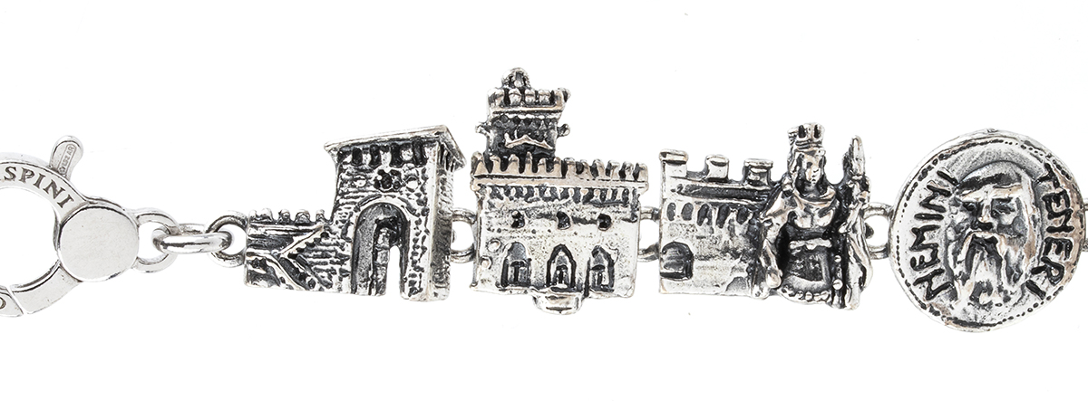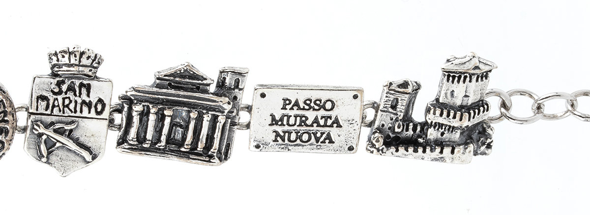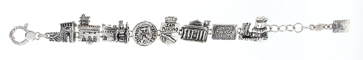Giovanni Raspini dedica un bracciale alla splendida città di S. Marino con rappresentazione dei tipici luoghi ed iscrizioni. Agento 925/1000, punzonato "GIOVANNI RASPINI - 132 AR - 925".