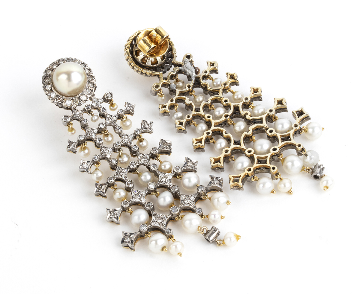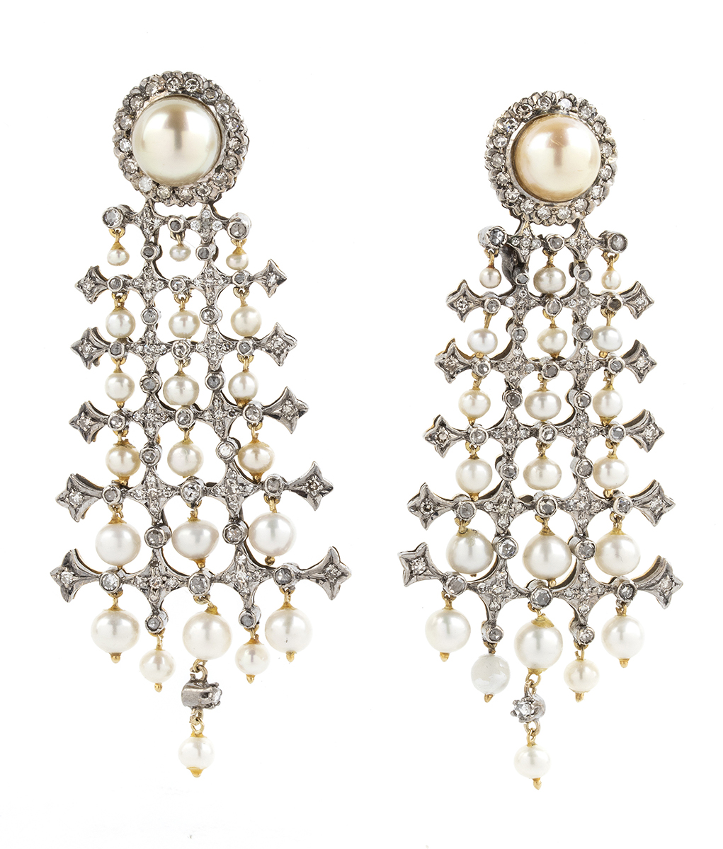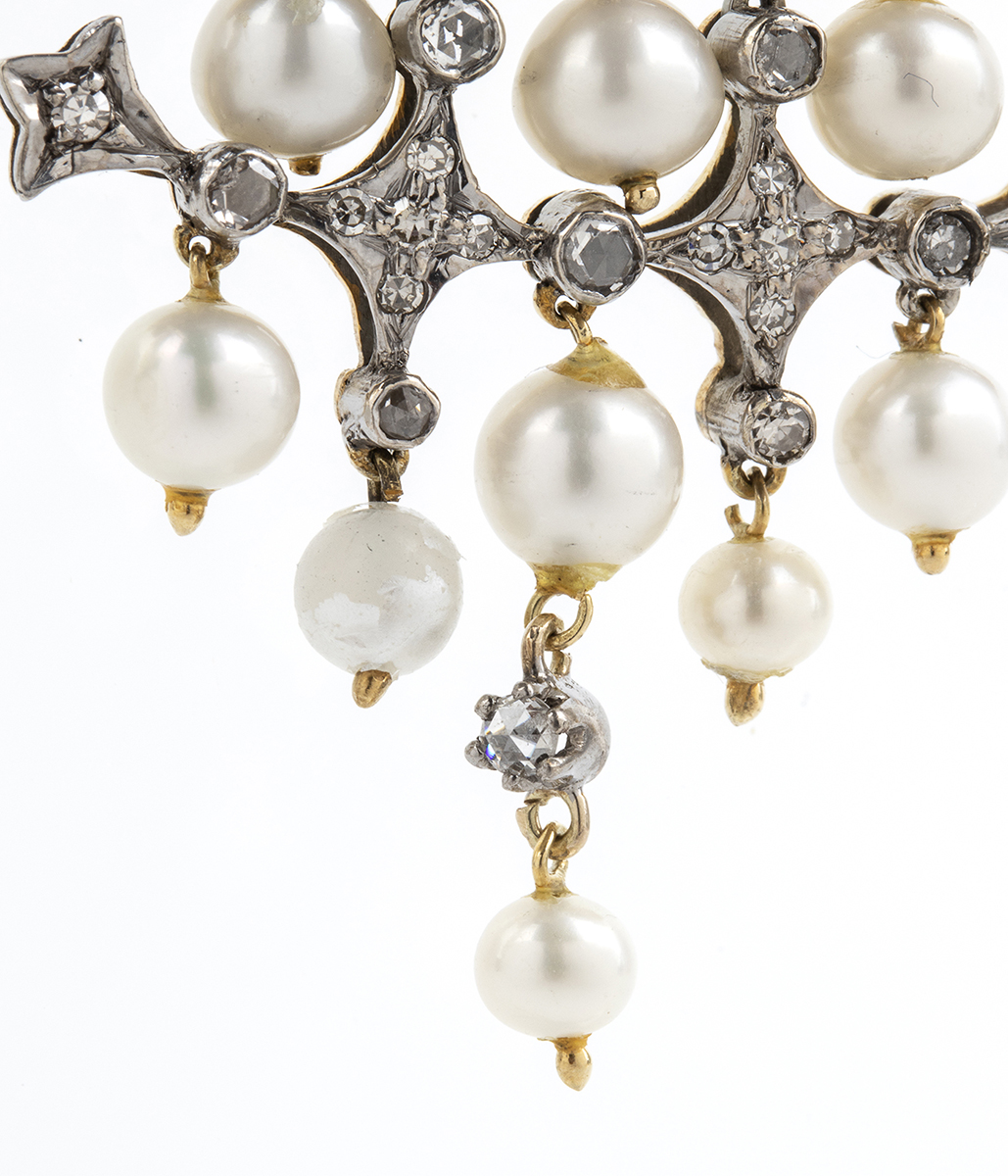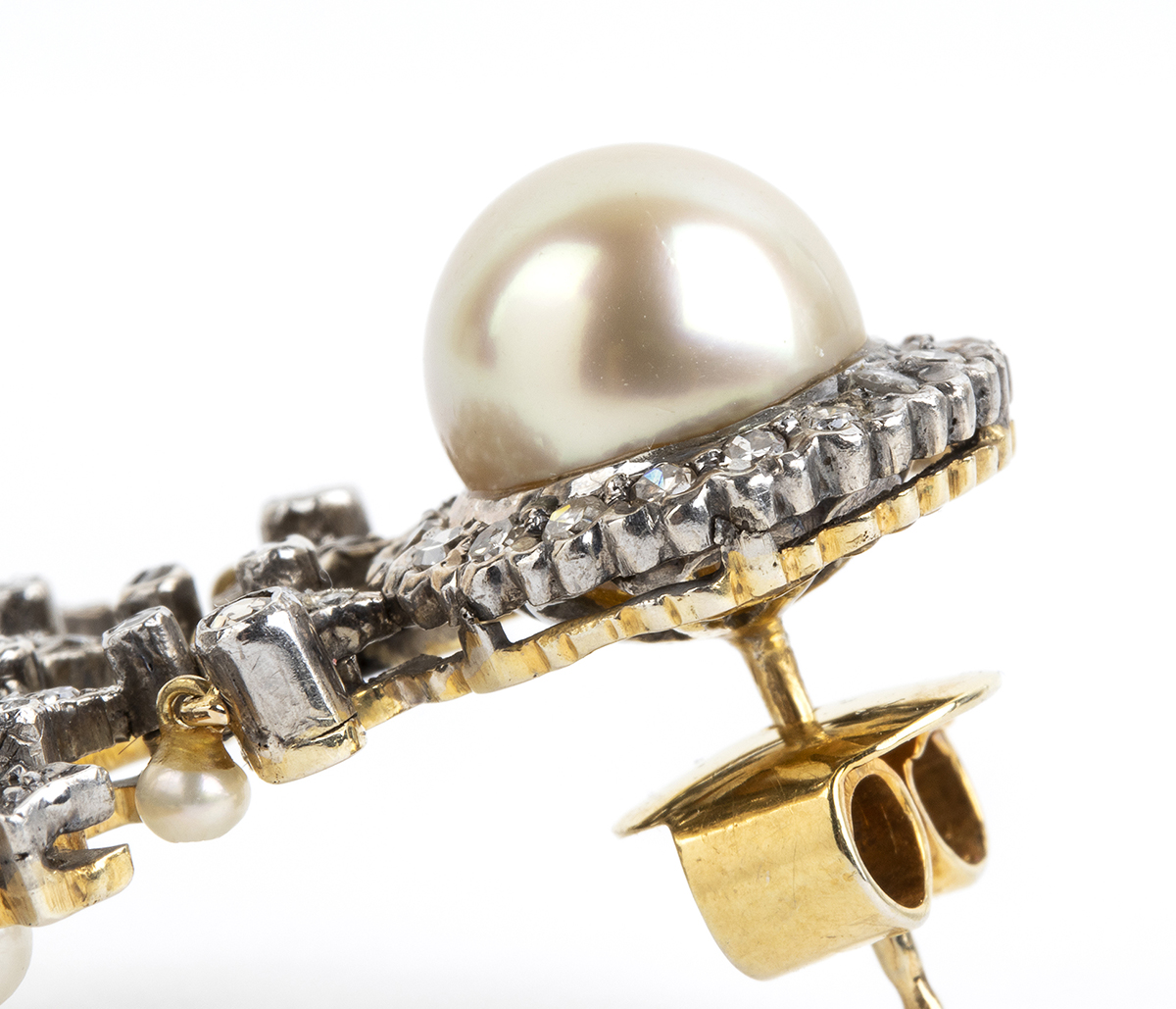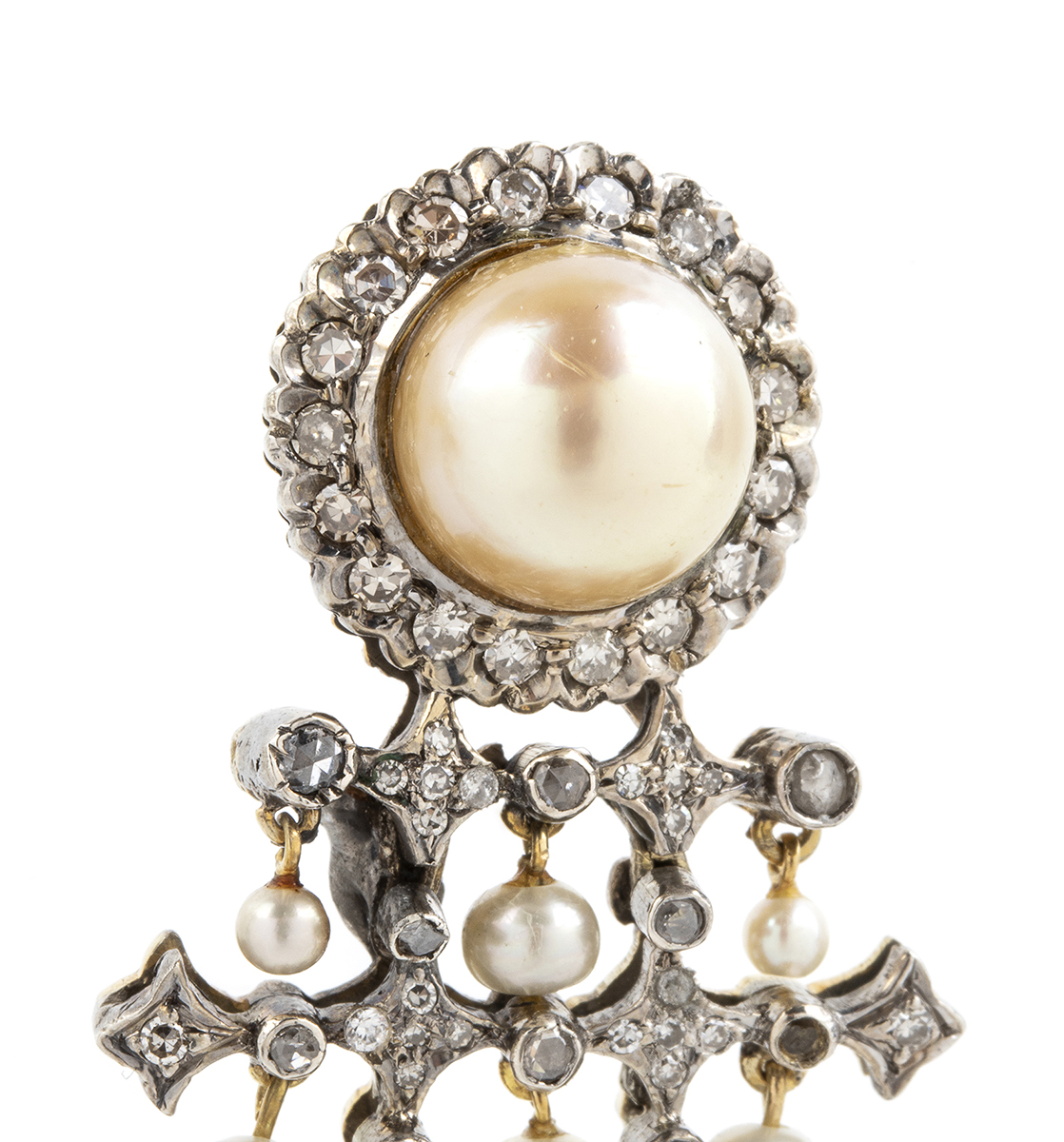 oro giallo 18k e argento 925/1000. Clip con perla South Sea incorniìciata da diamanti, a cui è sospeso un motivo a rete in perle coltivate "d'acqua dolce" e punteggiature di diamanti. Diamanti taglio huit-huit e taglio a rosa 5,00 ct circa. Dimensione 75 x 30 mm circa. Peso 25.8 gr circa.