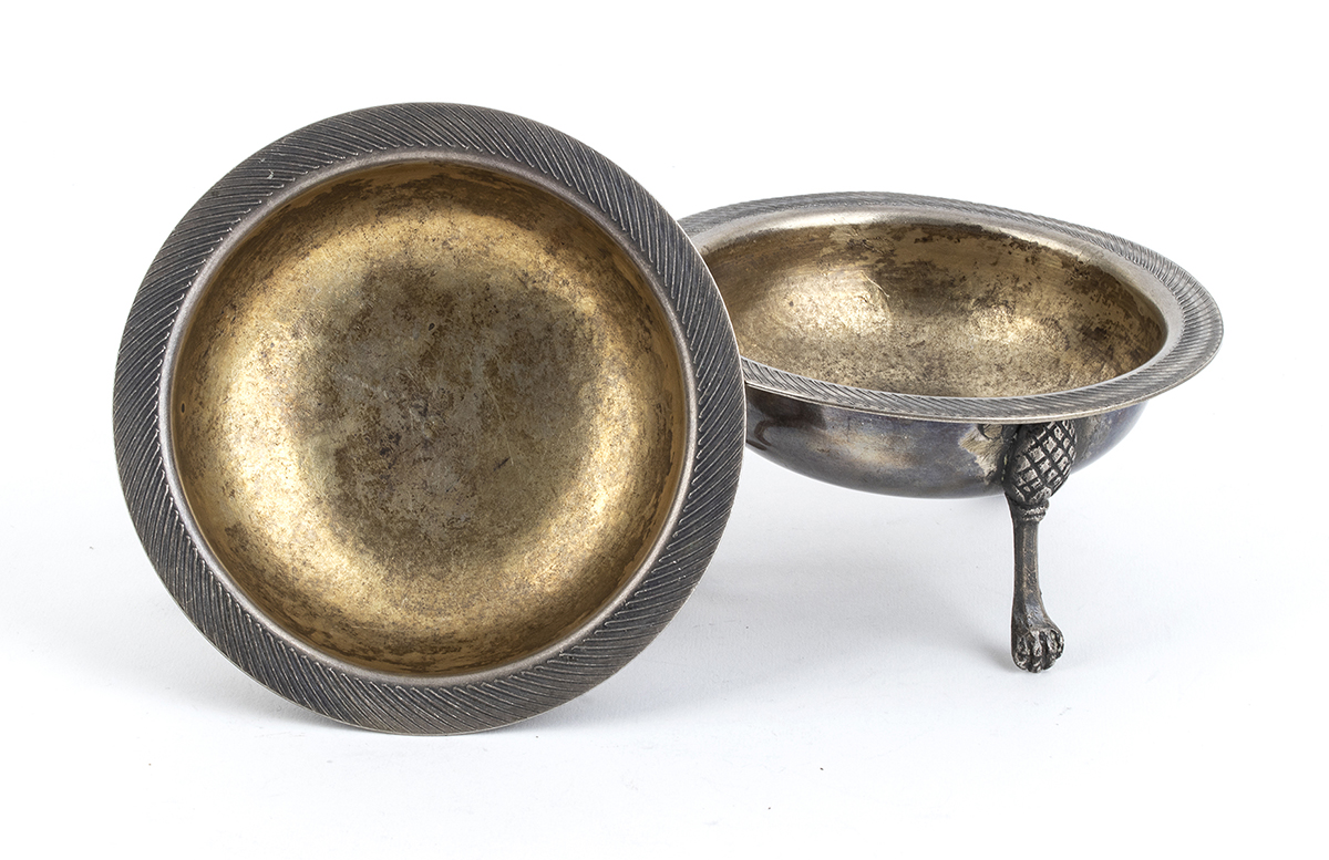 di forma circolare poggianti su tre piedini ad artiglio. Doratura interna. Punzonata con il marchio in uso alla corporazione degli orefici di Napoli per l'argento al titolo di 833/1000 o 10 once, 1832-1872.