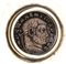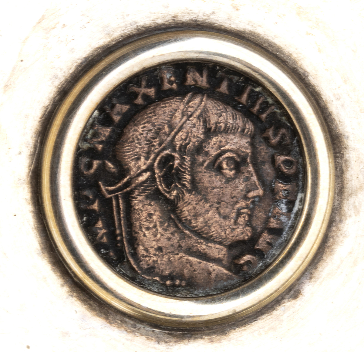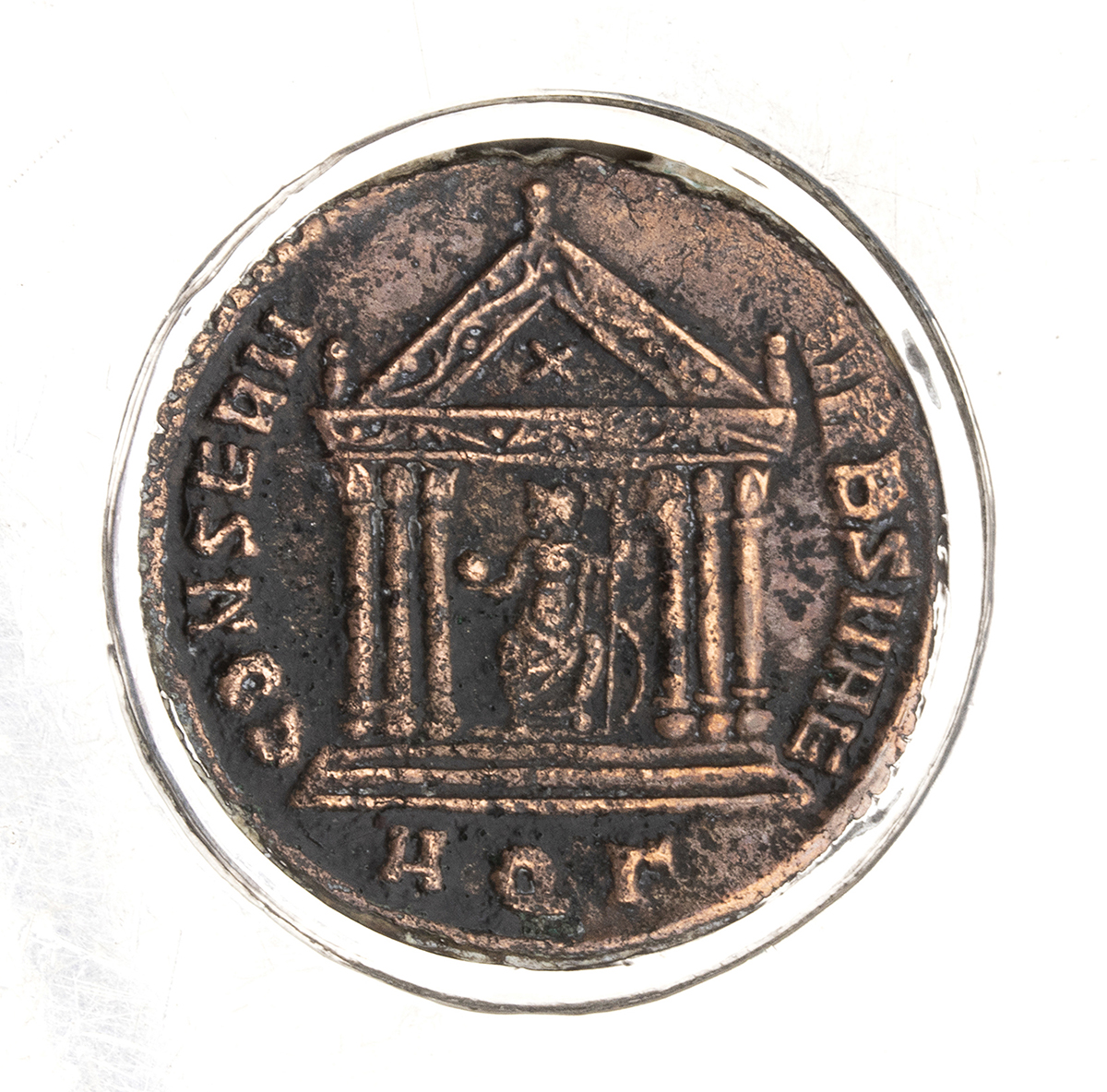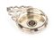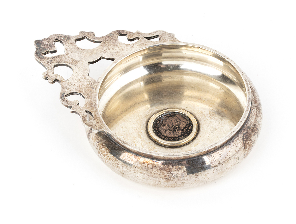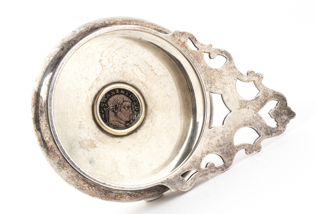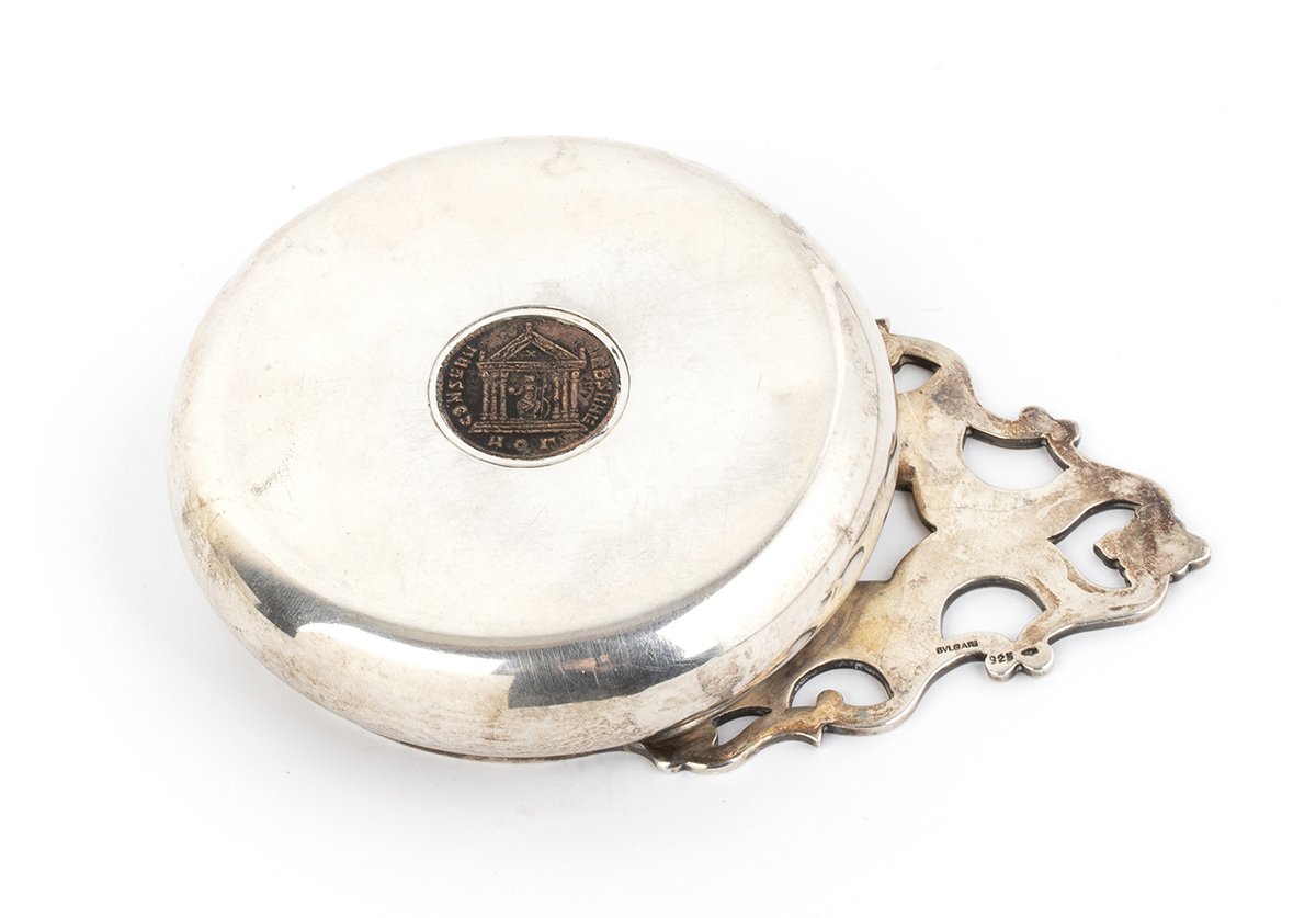 di forma circolare con presa traforata, il fondo incastonato con un Follis (308-9 d.C.) dell'Imperatore Massenzio - Aquileia. Argento 925/1000, punzonato "925 - BVLGARI - 36 Roma". Altezza 2,5 cm, diametro 9 cm, larghezza con manico 13,5 cm. Peso 173 gr.