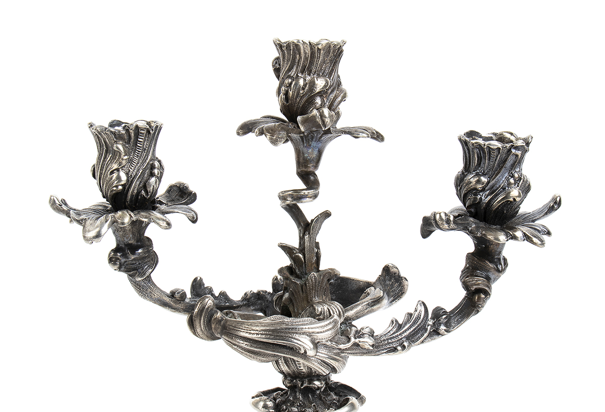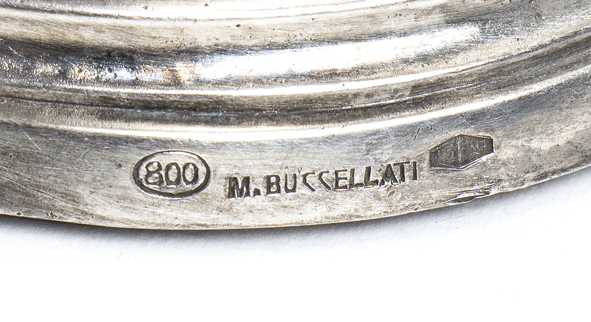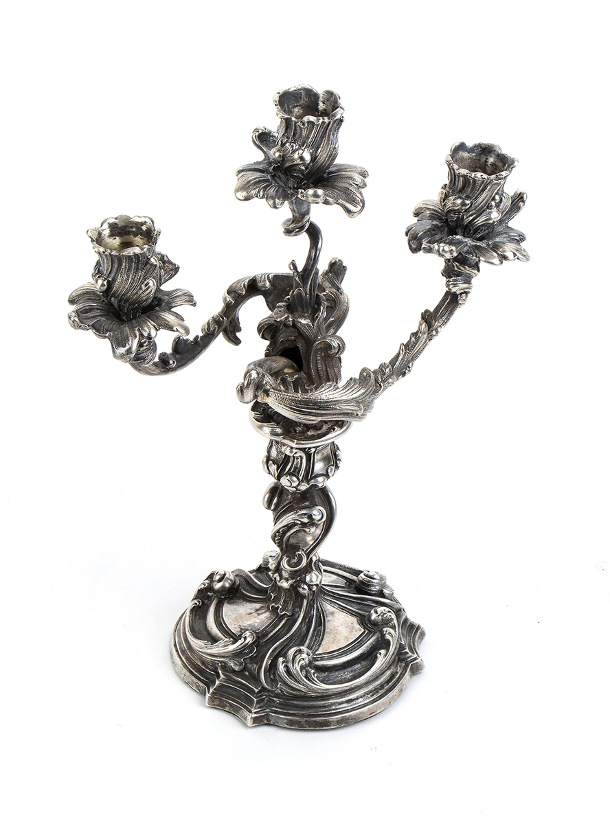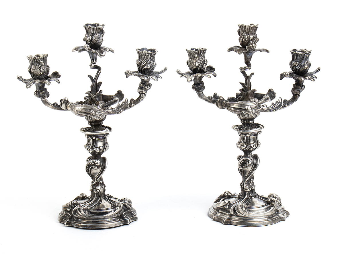 di linea rocailles, a tre luci, decorati a motivi vegetali. Punzonati "800 - M. BUCCELLATI - 15 fascio MI".