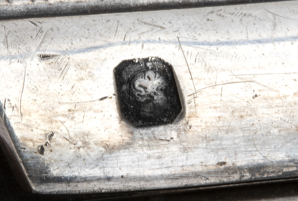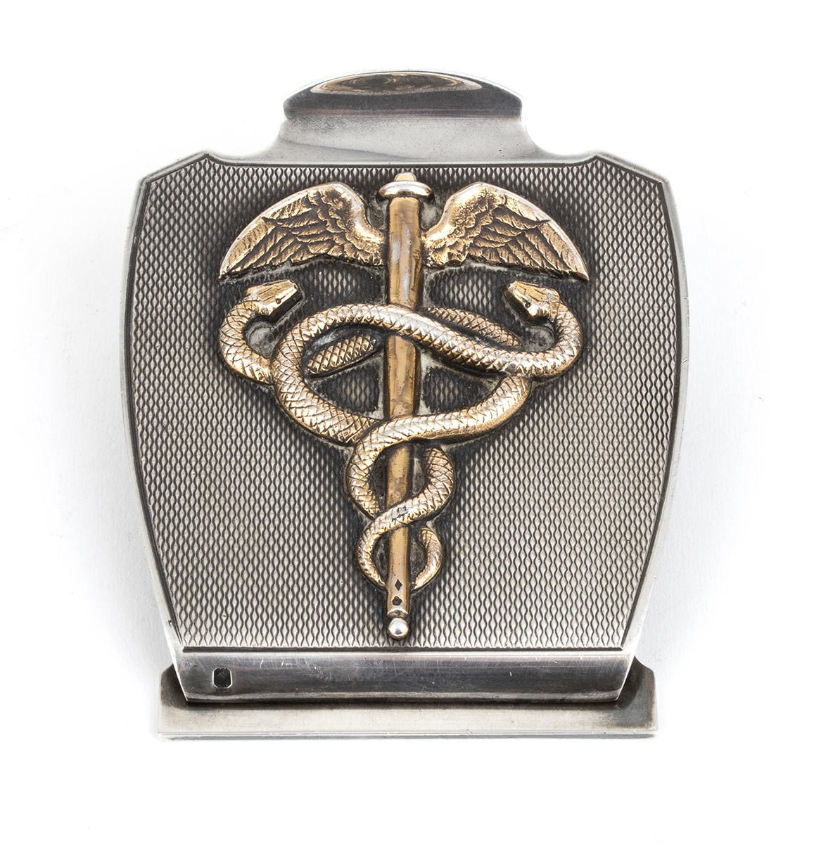 il fronte, lavorato a guilloché è decorato con il caratteristico caduceo, corto bastone intrecciato da due serpenti e sormontato da ali. Argento 950/1000, punzonato con i marchi per l'argento in uso a Parigi dopo il 1838.
