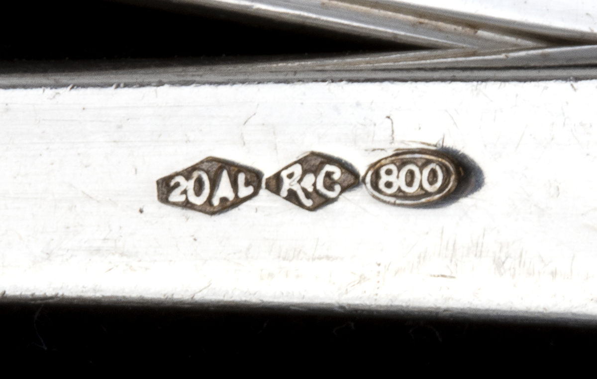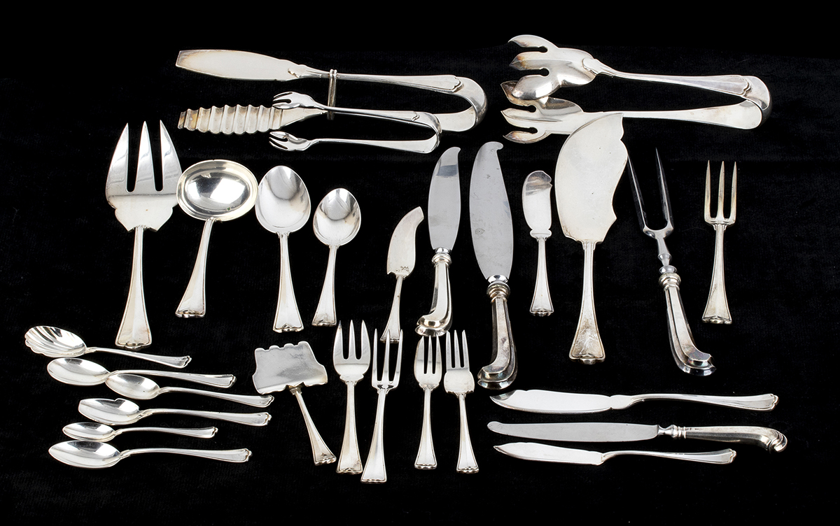 composto da 24 forchette grandi (17,5 cm), 12 coltelli (25 cm), 12 cucchiai grandi (18,5 cm), 12 forchette (14,5 cm), 12 coltelli da frutta (19,5 cm), 12 cucchiai medi (14,8 cm), 12 forchette (14,5 cm) e 12 coltelli da pesce (18,5 cm), 12 forchettine (13 cm) e 12 coltellini da dolce (15,5 cm), 12 cucchiaini da gelato (12,5 cm), cucchiaini da te (12,5 cm), 12 cucchiaini (11 cm), 12 cucchiaini da caffè (10 cm), 14 posate da portata. Argento 800/1000, punzonato "800", "20AL" e "RC", argentiere RICCI & C. S.p.A, Alessandria.
