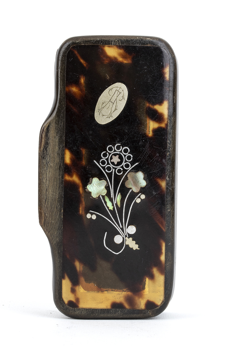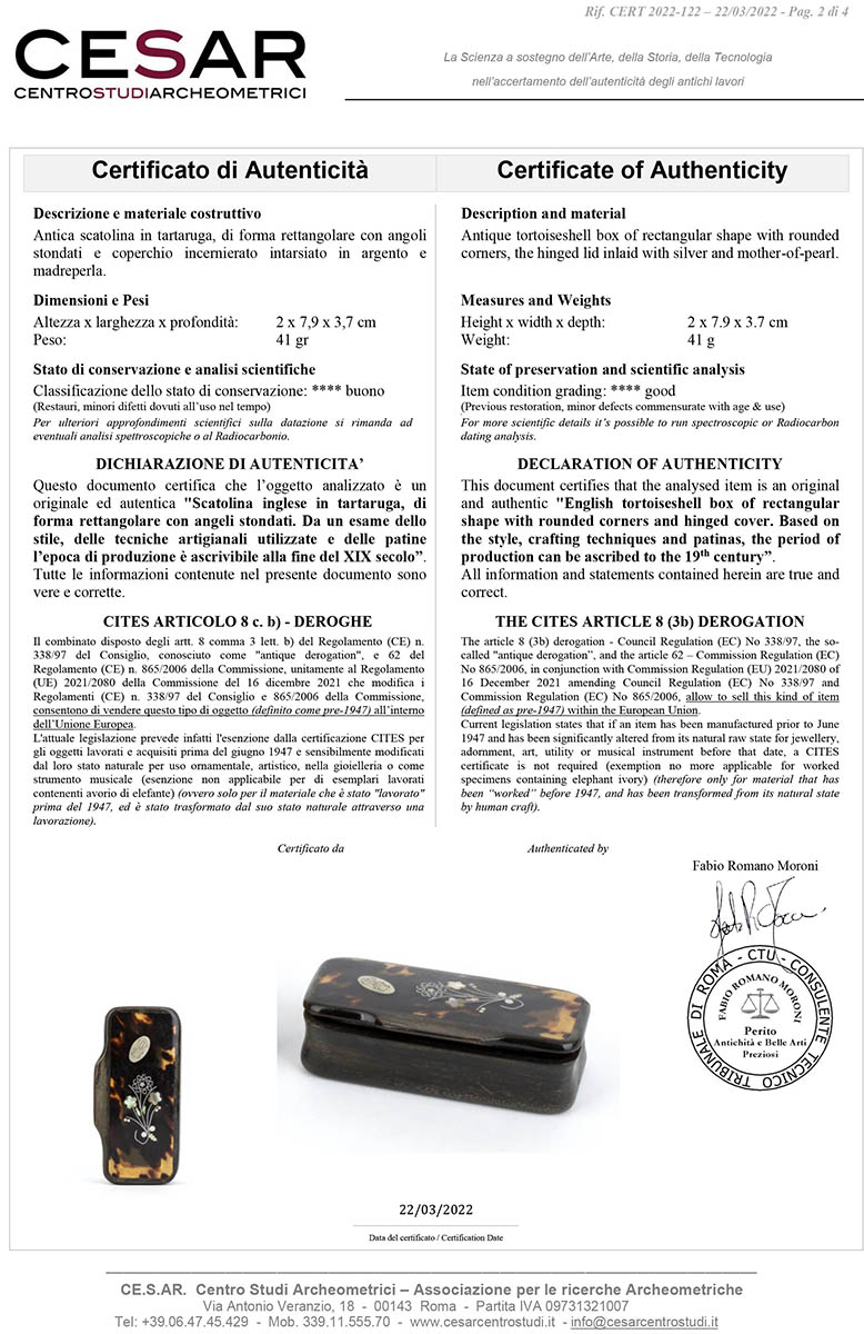 di forma rettangolare con angoli stondati e coperchio intarsiato in argento e madreperla, dimensioni 2 x 7,9 x 3,7 cm, peso 41 gr.