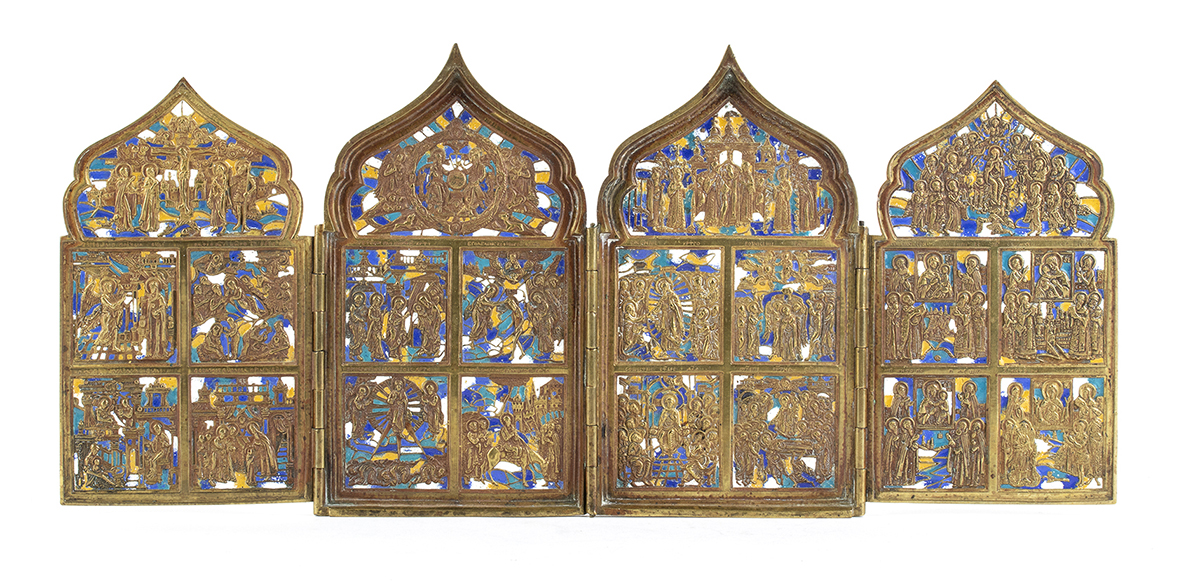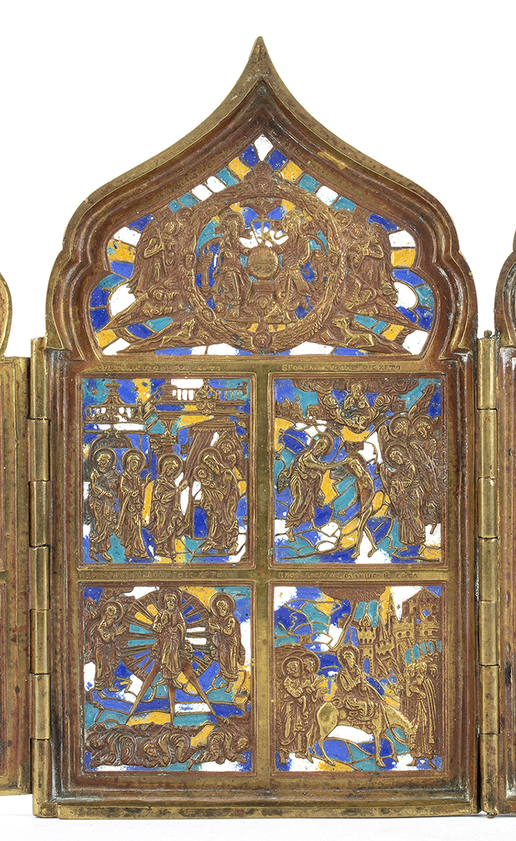 grande icona da viaggio realizzata in bronzo con cornice semplice sagomata e smalti policromi raffigurantescene della vita di Cristo.