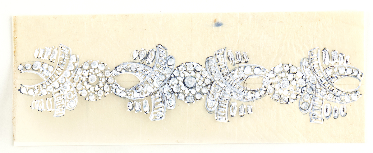 disegni di due orecchini, una spilla ed un bracciale in diamanti,.