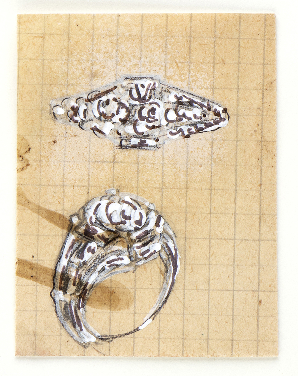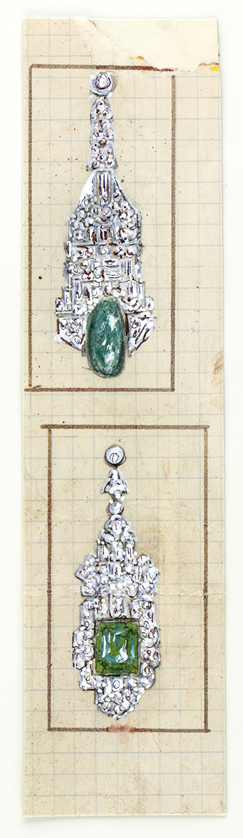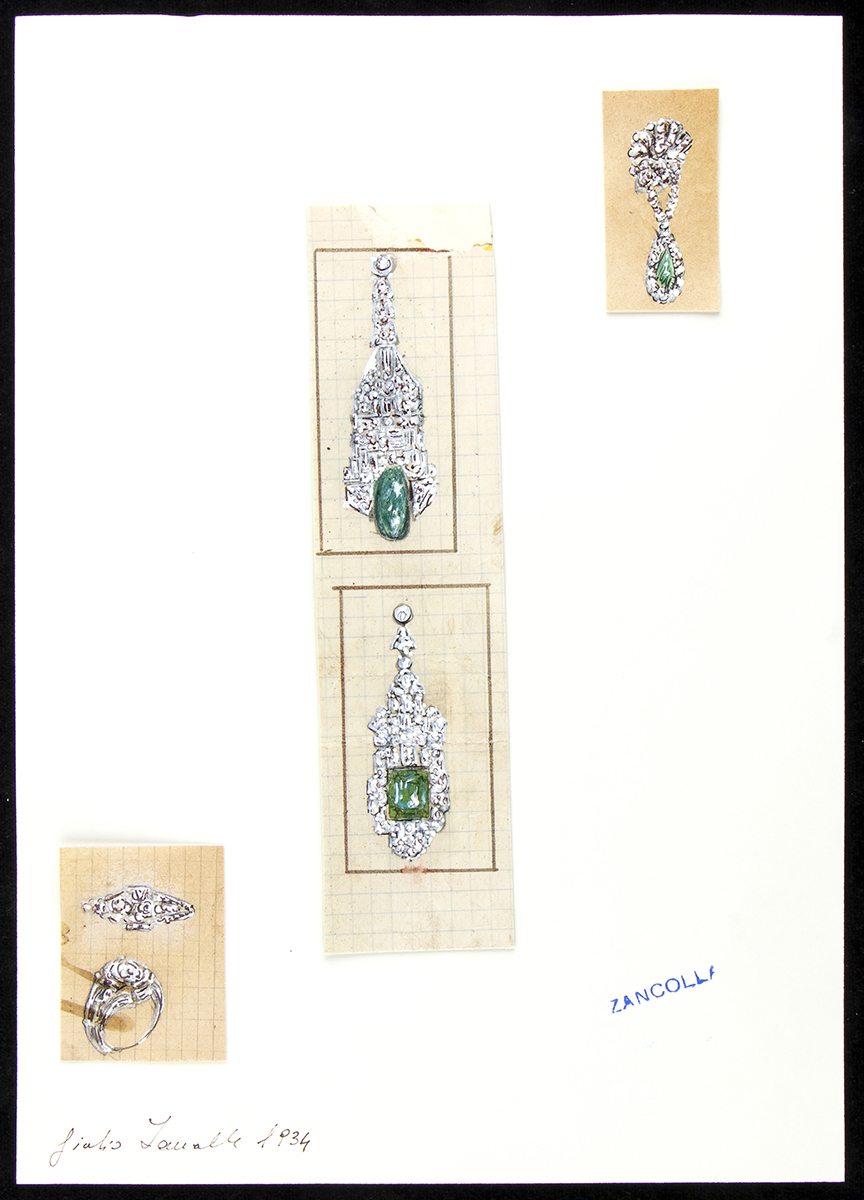 Progetto per orecchini ed anello - anni '40, GIULIO ZANCOLLA disegnatore ed orafo per BULGARI dal 1933 al 1940