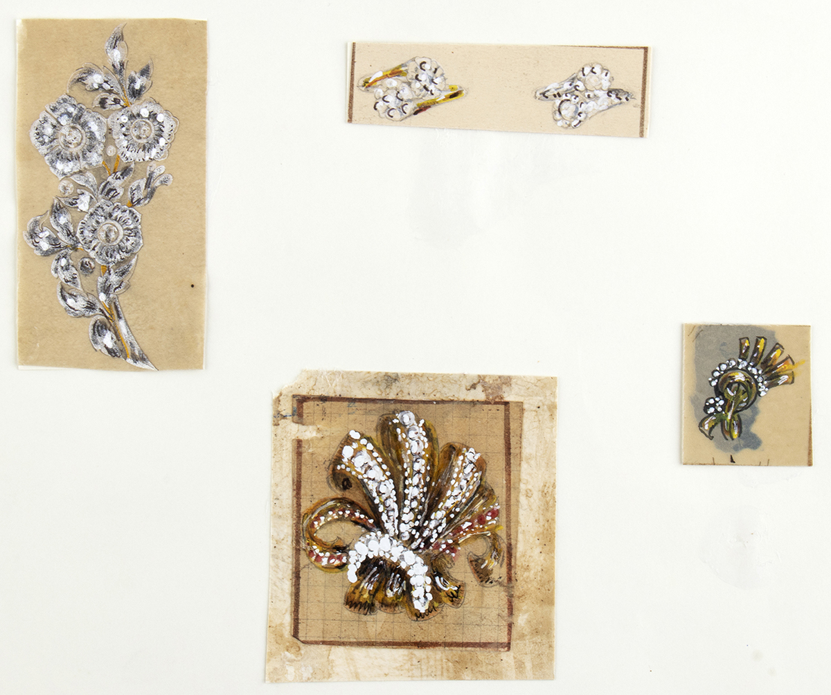 disegni di sei spille e due anelli in oro, diamanti e pietre.