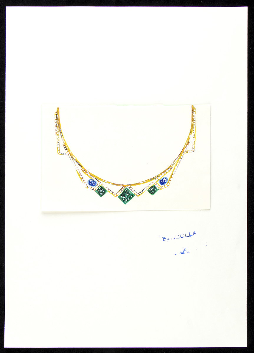 disegno di collana in oro diamanti, zaffiri e smeraldi.