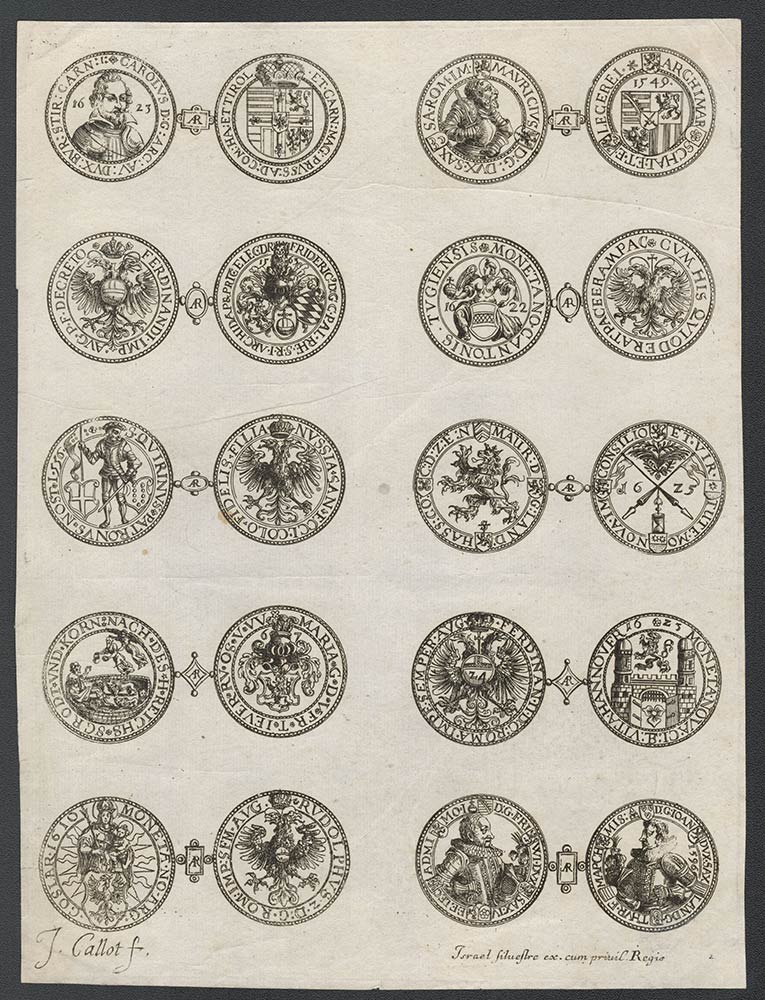 interessante foglio in tirattura tarda di stemmi nobiliari incisi da Callot e pubblicati da Israel Silvestre (1621-1691). Iscritto: 'J. Callot f. Israel Silvestre ex. Cum privil. Regis 2.'.