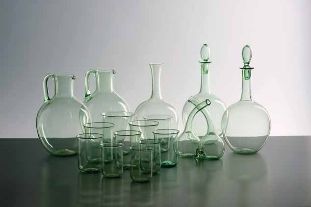 Venini. Servizio di bicchieri in vetro composto da trentasei bicchieri, due caraffe, due bottiglie con tappo, una bottiglia senza tappo e un’oliera, 1930 circa. Firma ad acido: Venini Murano misure diverse