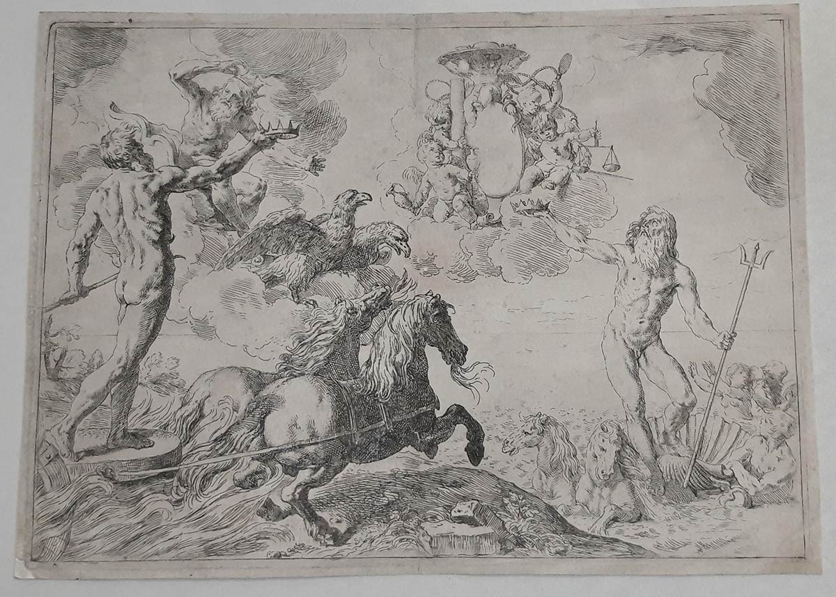 Lot 91 | SIMONE CANTARINI DT IL PESARESE (1612-1648: Giove, Nettuno e Plutone fanno omaggio delle loro corone alle armi del Cardinal Borghese, 1642