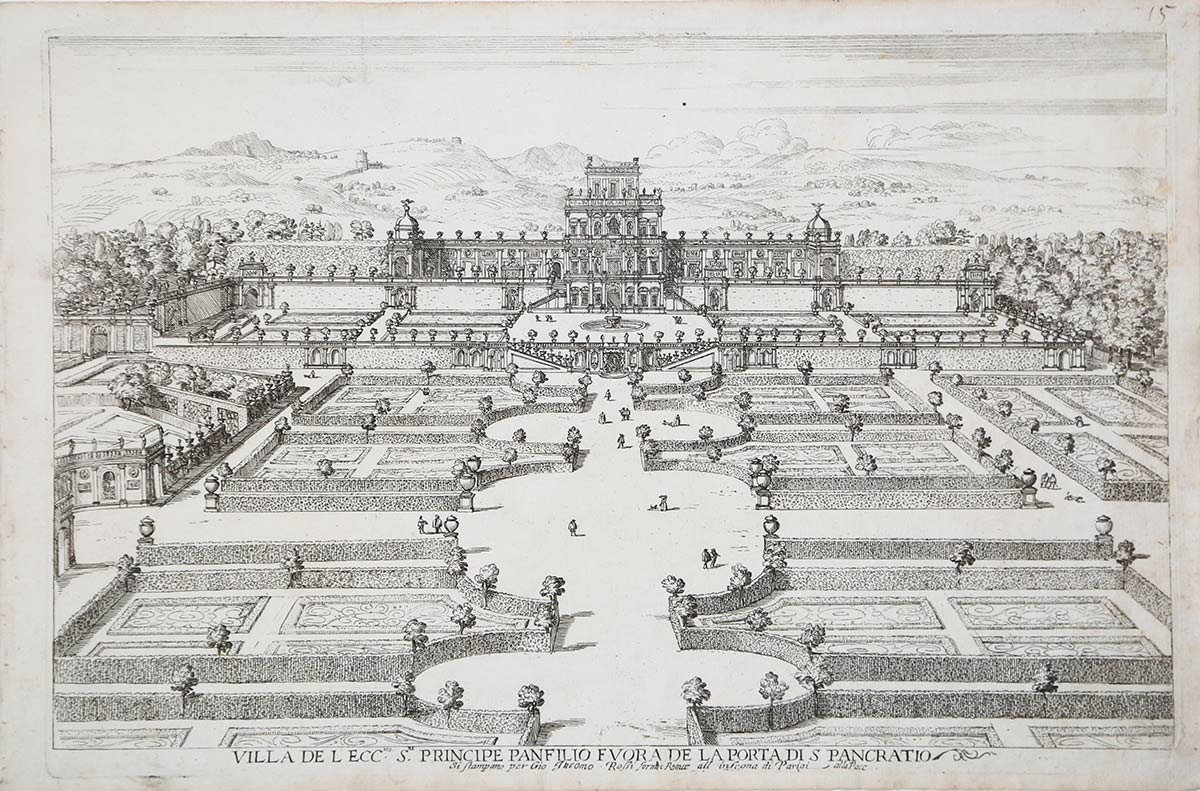 Bellissima veduta della Villa Phamphili stampata dalla tipografia di Giovanni Giacomo de Rossi alla metà del XVII secolo ed attribuita al Barriere, specialista di incisioni di ville e giardini.