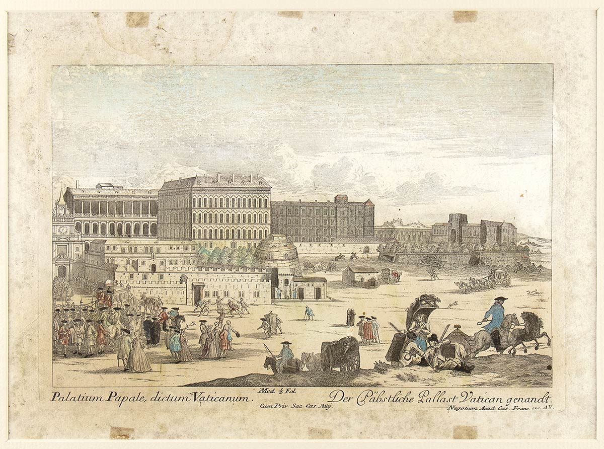 Veduta ottica raffigurante il palazzo papale in Vaticano. Iscritta su lastra in basso: Med. 1/2 Fol. | Cum Priv. Sac. Caes. Maj. | Negotium Acad. Caes. Franc. Exc. AV.