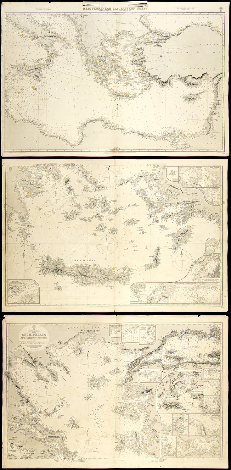 Tre rare carte nautiche. Titolo: Mediterranean archipelago: surveyed by Captains R. Copeland, T. Graves, & T. Spratt , and the officers of H.M.S. Mastiff, Beacon, Volage, & Medina, 1832 to 1863 : with additions and corrections to 1881