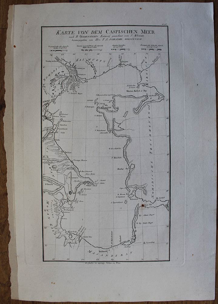 Pubblicata a Vienna da Franz Anton Schaembl. La mappa raffigura la costa del Mar Caspio, nominando le principali città della costiera.