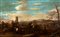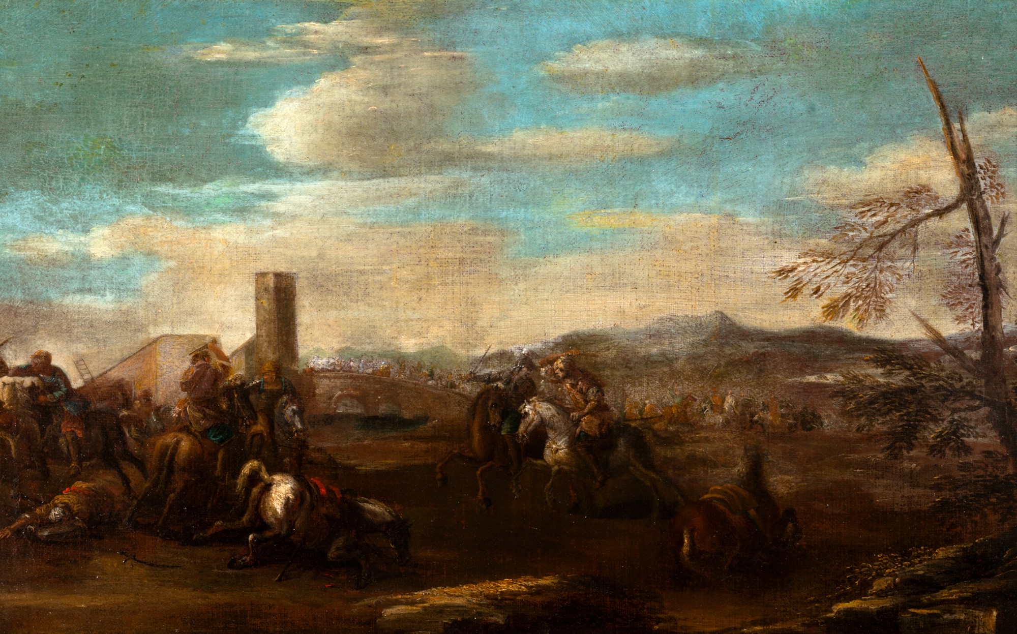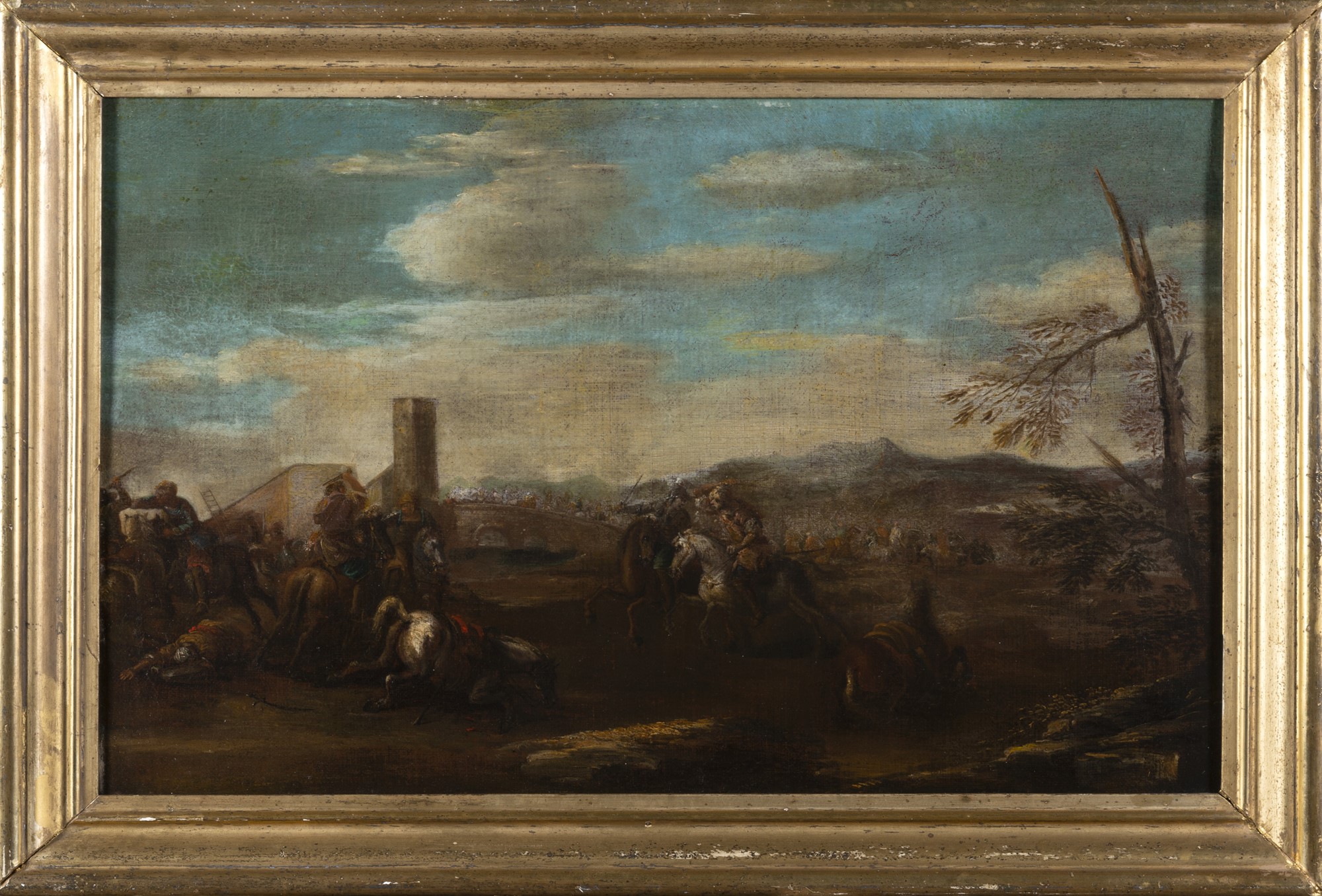 Scuola italiana, secolo XVII - Paesaggio con scontro di cavalieri