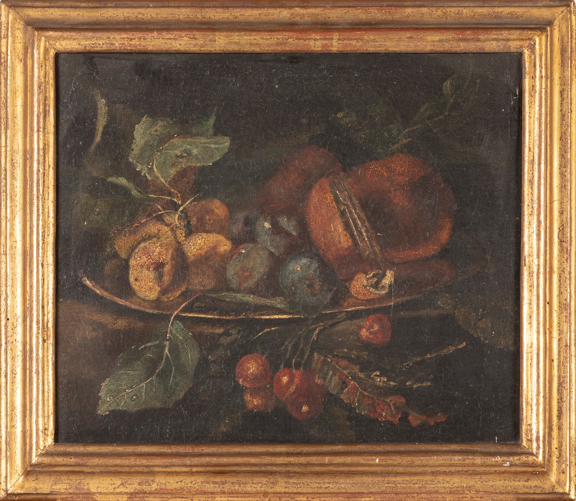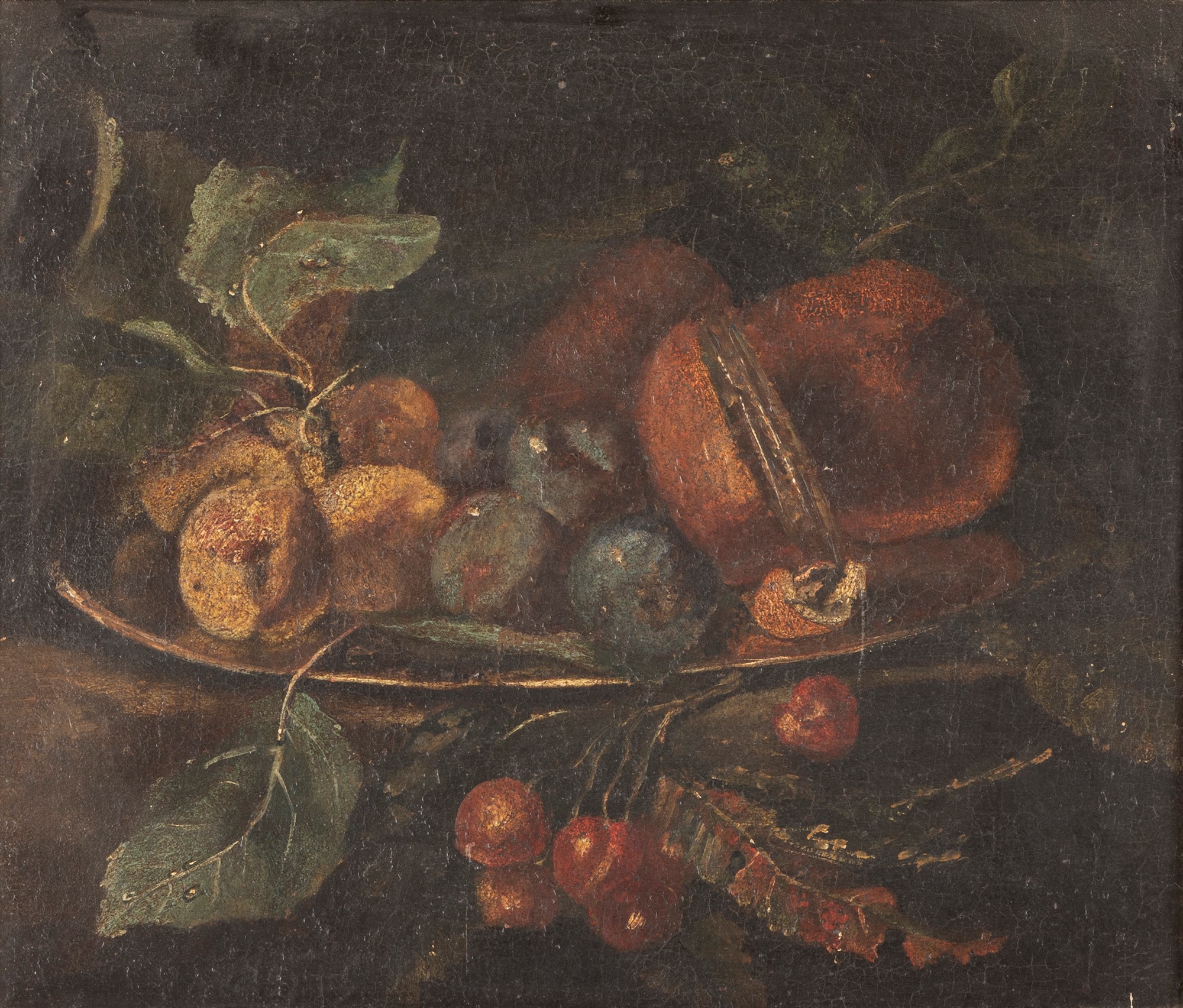 Scuola italiana, secolo XVII - Alzata con ciliegie, prugne ed altri frutti