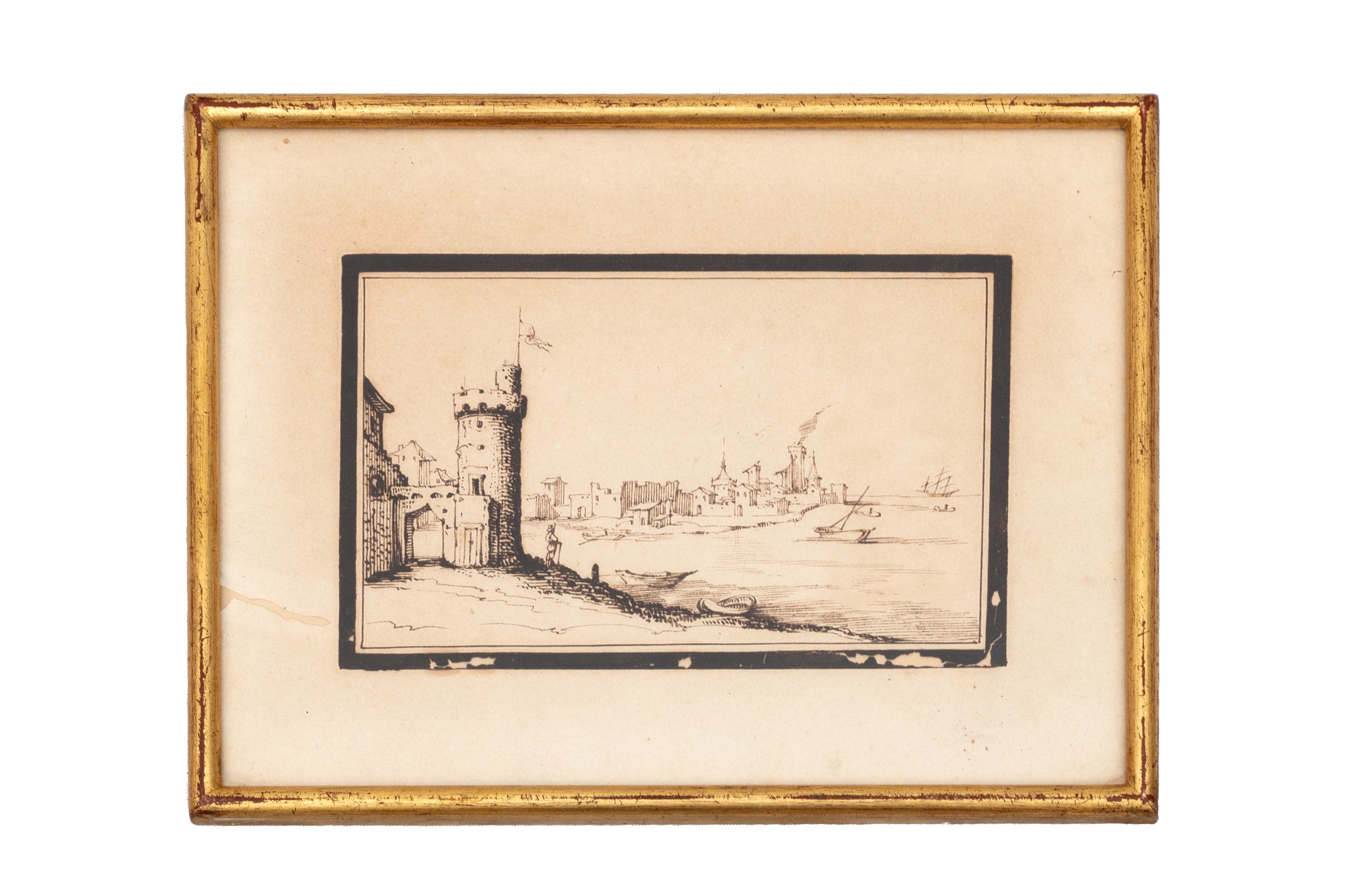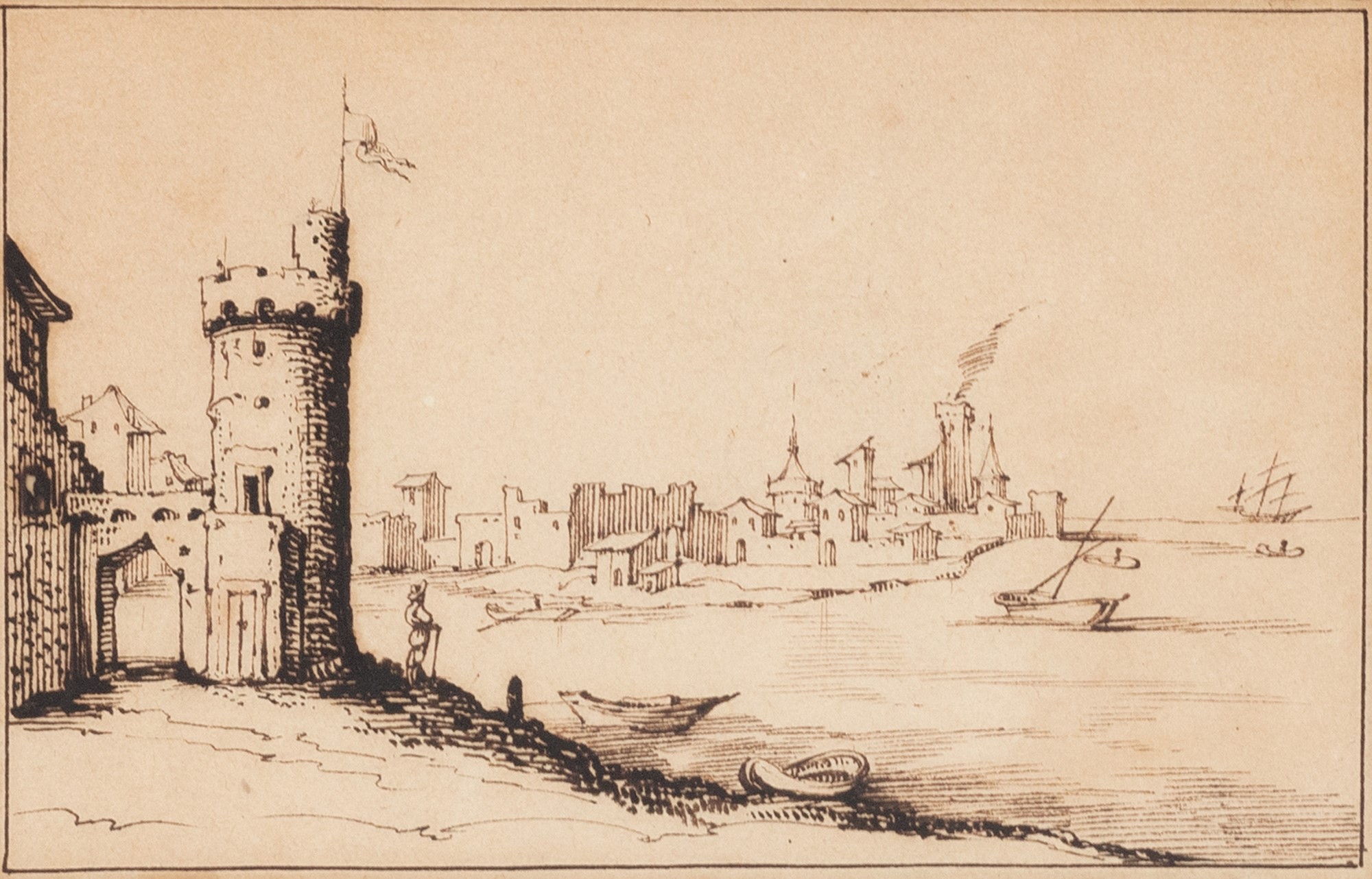 Pittore fiammingo attivo in Italia, secolo XVII - Marina con porto e torre circolare