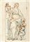a) Studio di figura allegorica femminile con putto; penna, inchiostro bruno e acquerello azzurro su carta controfondata, mm 186 x 136
