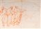 a) Attribuito a Andrea Sacchi (Roma 1599 - 1661), Studio di tre figure ammantate entro lunetta (recto) e studi di figure (verso), matita rossa su carta, mm 191 x 272;