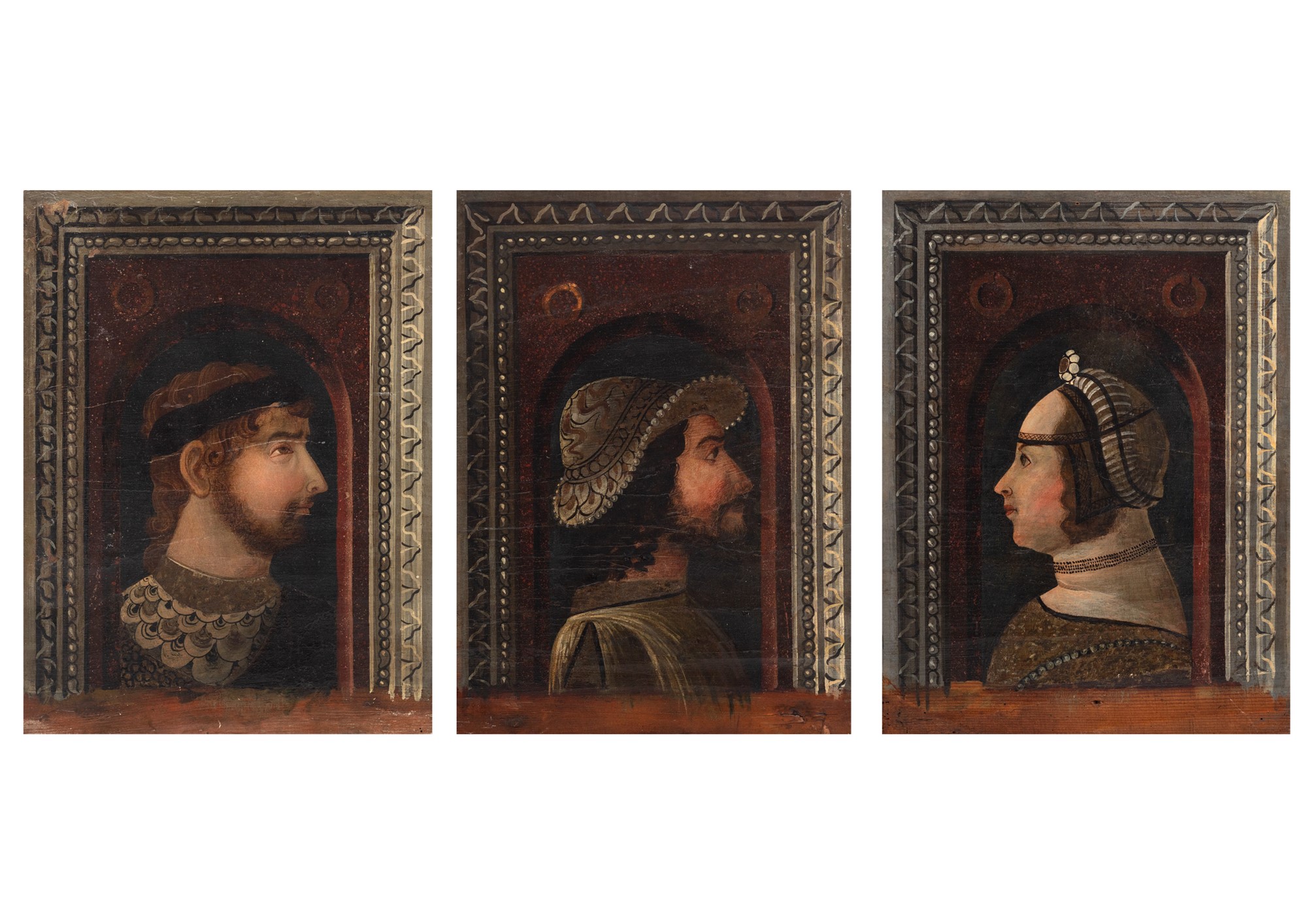 Maestro di Monticelli (Gerolamo Bembo?) attivo intorno al 1480-1490 - Due ritratti di gentiluomini e un ritratto di gentildonna (probabilmente Bona di Savoia, duchessa di Milano)