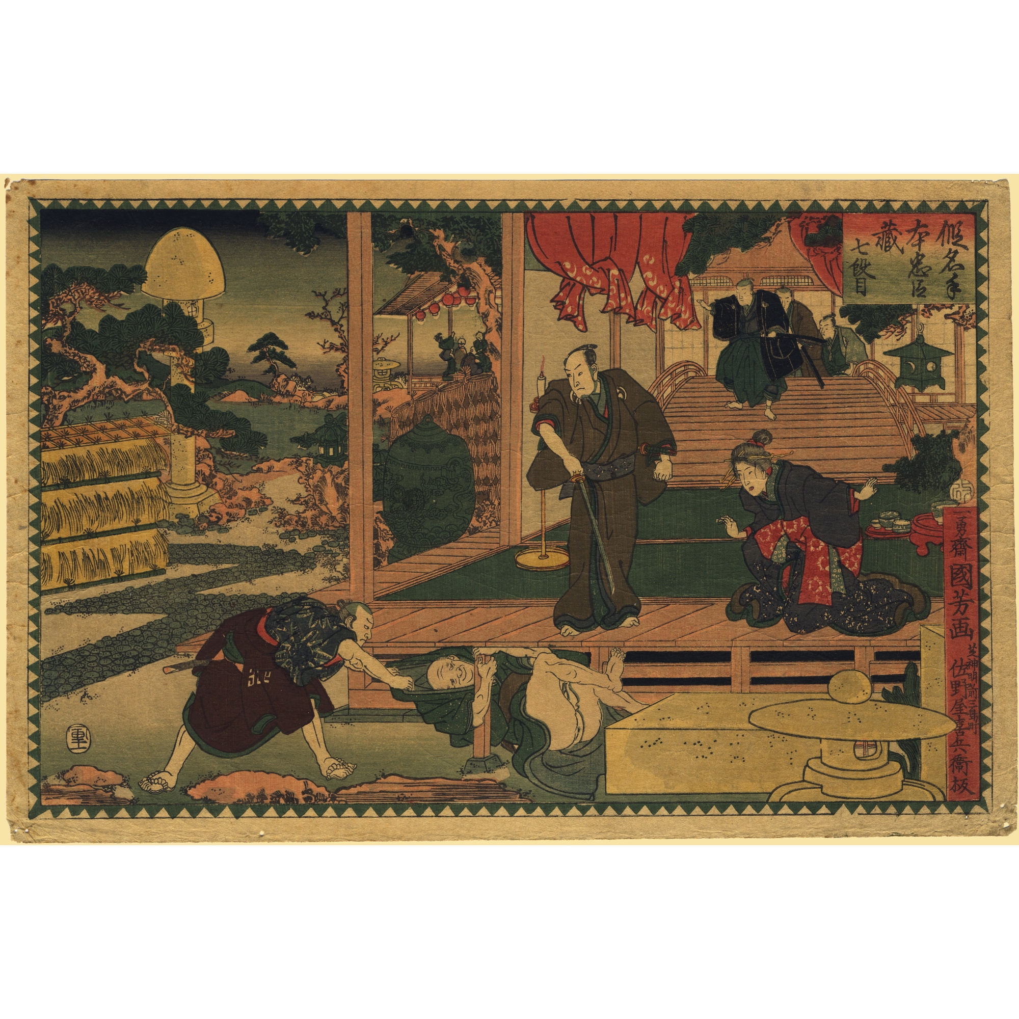 UTAGAWA KUNIYOSHI (1797 - 1861), Atto VII. La spia Kudayu viene scoperta, 1854-55. Xilografia a colori firmata in lastra ''Ichiy?sai Kuniyoshi ga''. Serie: Kanadehon Chushingura. Formato: oban (mm. 230x355). Editore: Tsujiokaya Kamekichi. Censore: aratame. Edizione: Periodo Edo (1854-55)