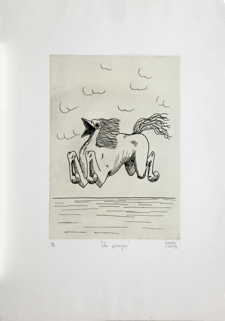 MAURICE HENRY(FRANCIA 1907 - MILANO 1984)'La panique'incisione su carta esemplare n. 99/130cm 69,5x50firmata in basso a destratitolata in basso al centronumerata in basso a sinistra