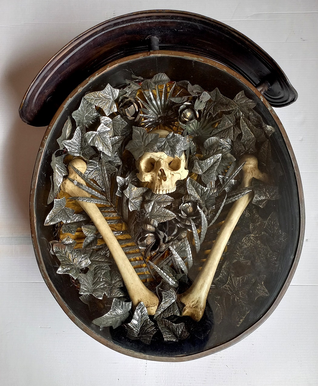 Memento Mori - XX secolo - teca in metallo e vetro e fogliame in metallo cm.77,5x60x20