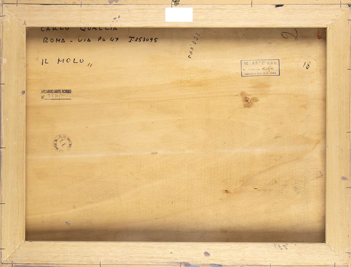 Firmato in basso a sinistra: "C. Quaglia". Al retro: timbro della M. Arte di Roma, dell' Archivio Arte Rosso e titolato "Il molo".
