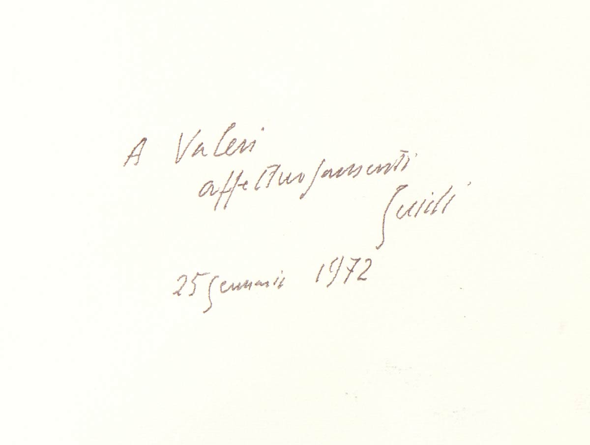 Firmato in basso a sinistra: Guidi. Al retro una dedica e data: "A Valeri, affettuosamente, Guidi, 25 gennaio 1972"