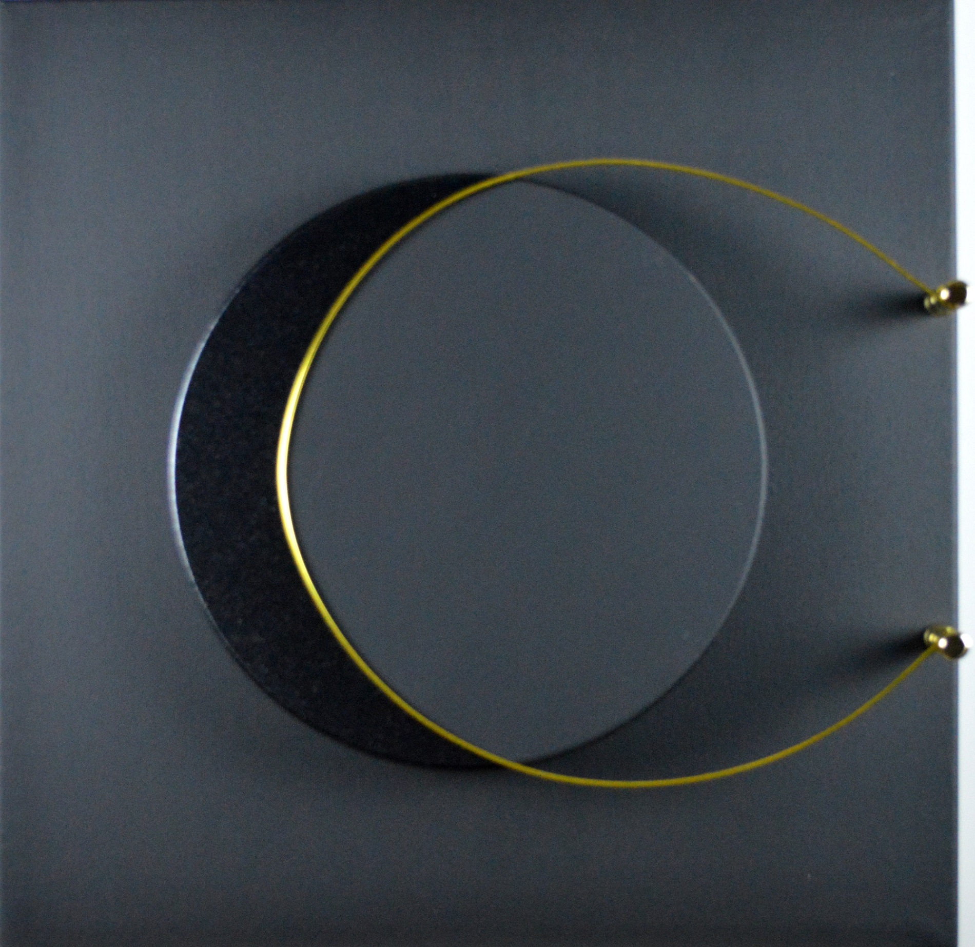 BANI BRUNO Milano 1964 “Eclissi parziale nera” due tele sovrapposte con sistema a led telecomandato e filo rigido in metallo, cm 50x50 del 2018. Sul retro numero d’archivio, titolo, data e firma. Autentica su foto dell’artista e fotografie dell’artista con l’opera mentre la firma.