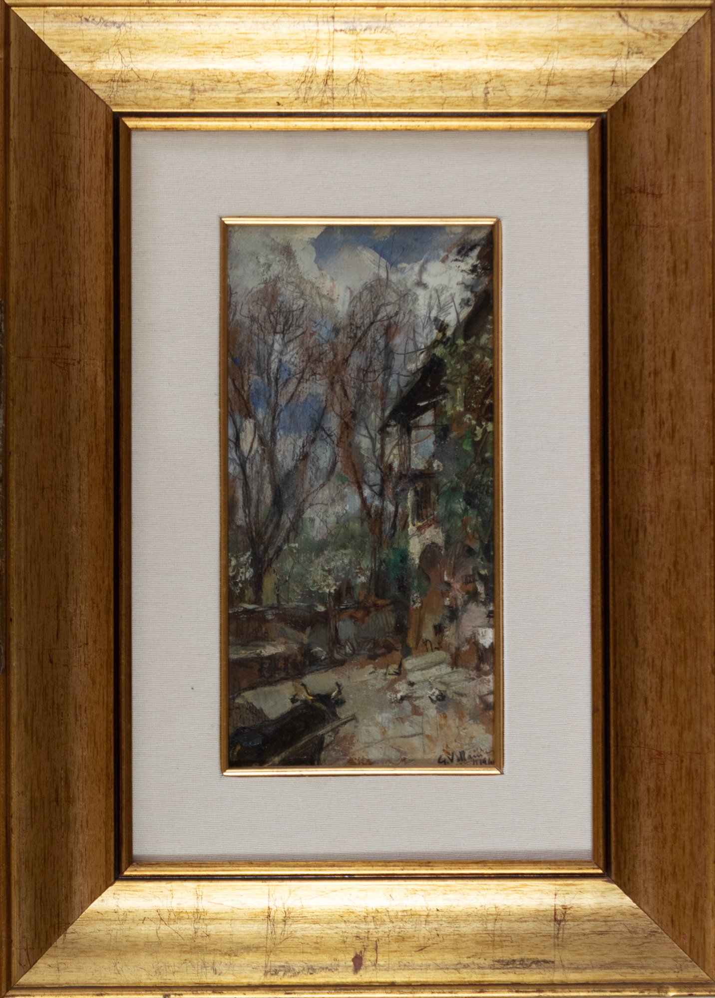 Gennaro Villani (Napoli 1885 - 1948), Cortile, olio su cartone, 30x16 cm