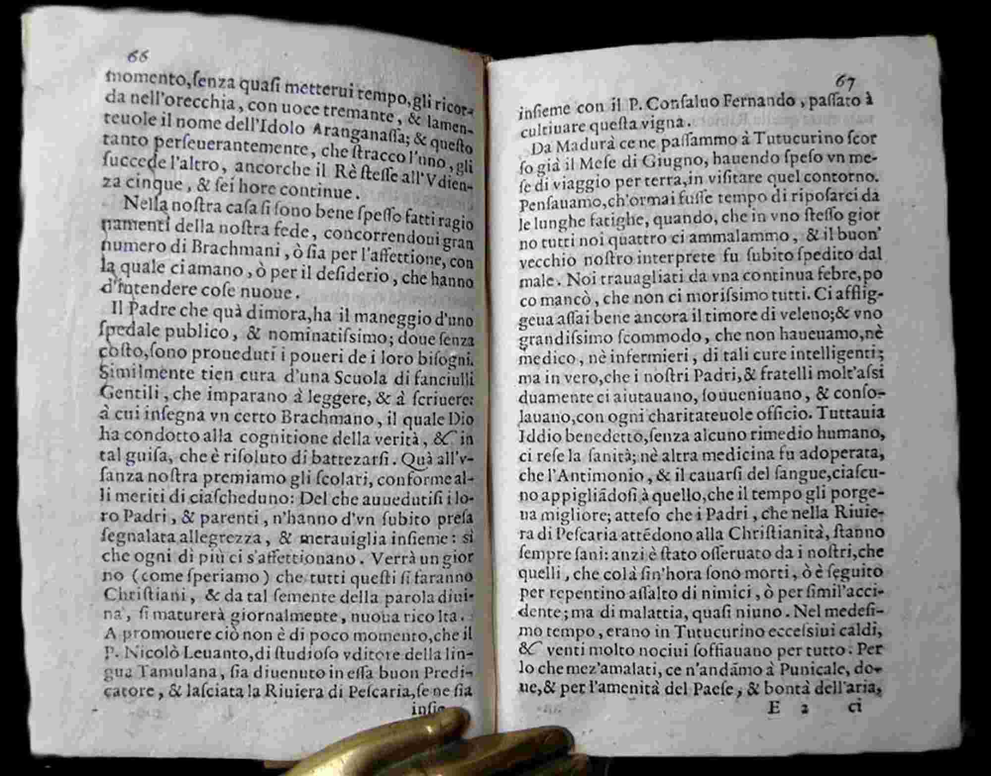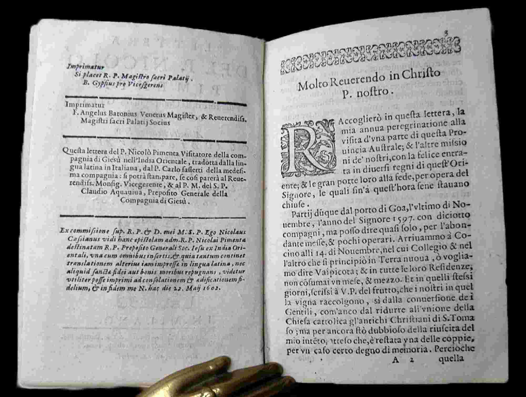 The work is a collection of letter-relations from the Jesuit missions of the Southeast Asian territories, during a long and dangerous journey to the various missions, carried out between the end of 1597 and 1599. Thus, we can observe reports from Bengal, Burma, Malacca and southern India coastal cities, such as Madras (today Chennai), Calicut (today Kozhikode) and Chandragiri. Ref OCLC 64035267; Sommervogel VI, 757-758