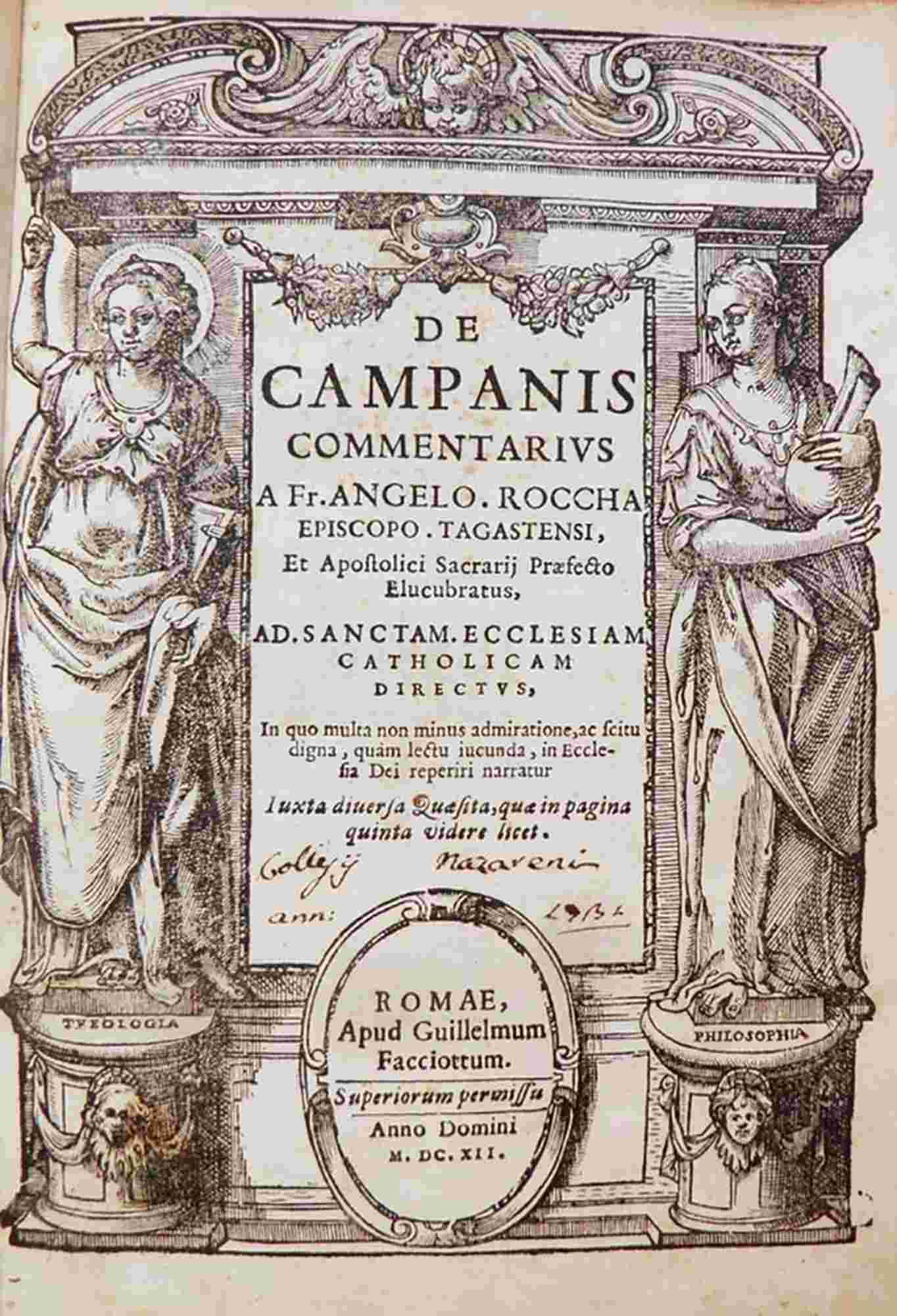 ANGELO ROCCHA (1545-1620): De Campanis commentarius a Fr. Angelo Roccha Episcopo Tagastensi, et apostolici sacrarij Praefecto elucubratus ... Romae, apud Guillelmum Facciottum, 1612