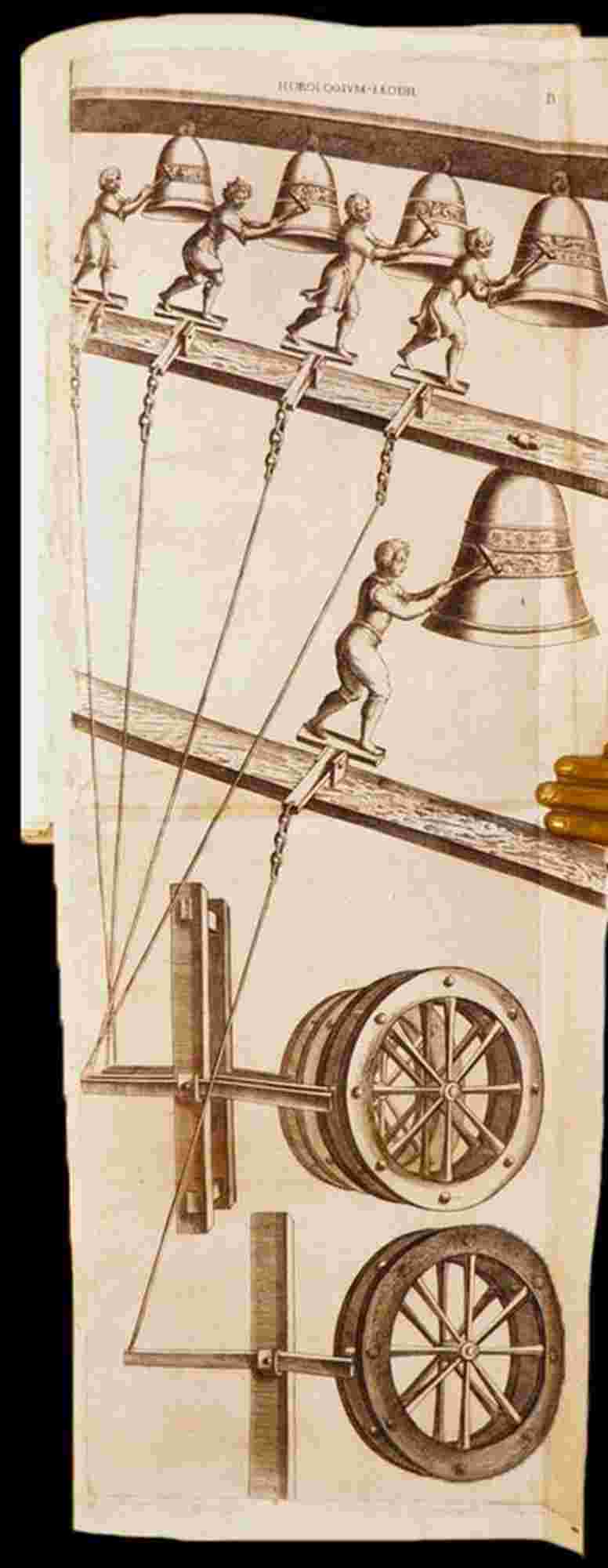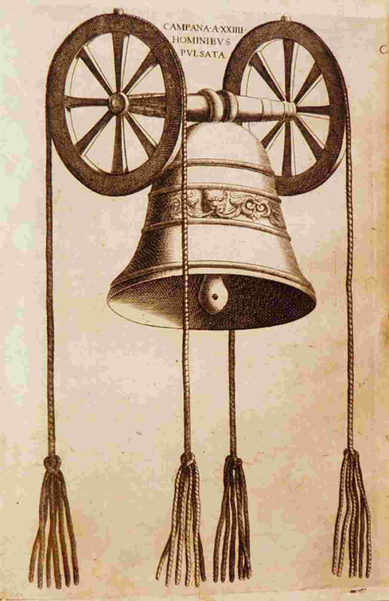 First edition. Angelo Rocca (1545-1620), scholar and philologist, is best remembered as the founder of the Biblioteca Angelica and bishop in partibus of Tagaste; was also a collaborator of the Manutius and director of the Vatican Printing House under Sixtus V and an active collaborator in drafting the text of the ‘vulgata’ bible, definitively edited in 1592. He also wrote some books concerning astronomy, mentioned by Riccardi. One of the first treatises exclusively devoted to bells (preceded only by Maggi’s De tintinnabulis, published in 1608), the present work describes the origin of bells, their terminology, the functions of the bell-ringer and the liturgical occasions in which the bells are played. The four beautiful plates depict the clock of San Marco in Venise, the clock in Liège and an illustration of chimes, reproduced later in the Frisius edition of Maggi's book as well as in Bonanni.