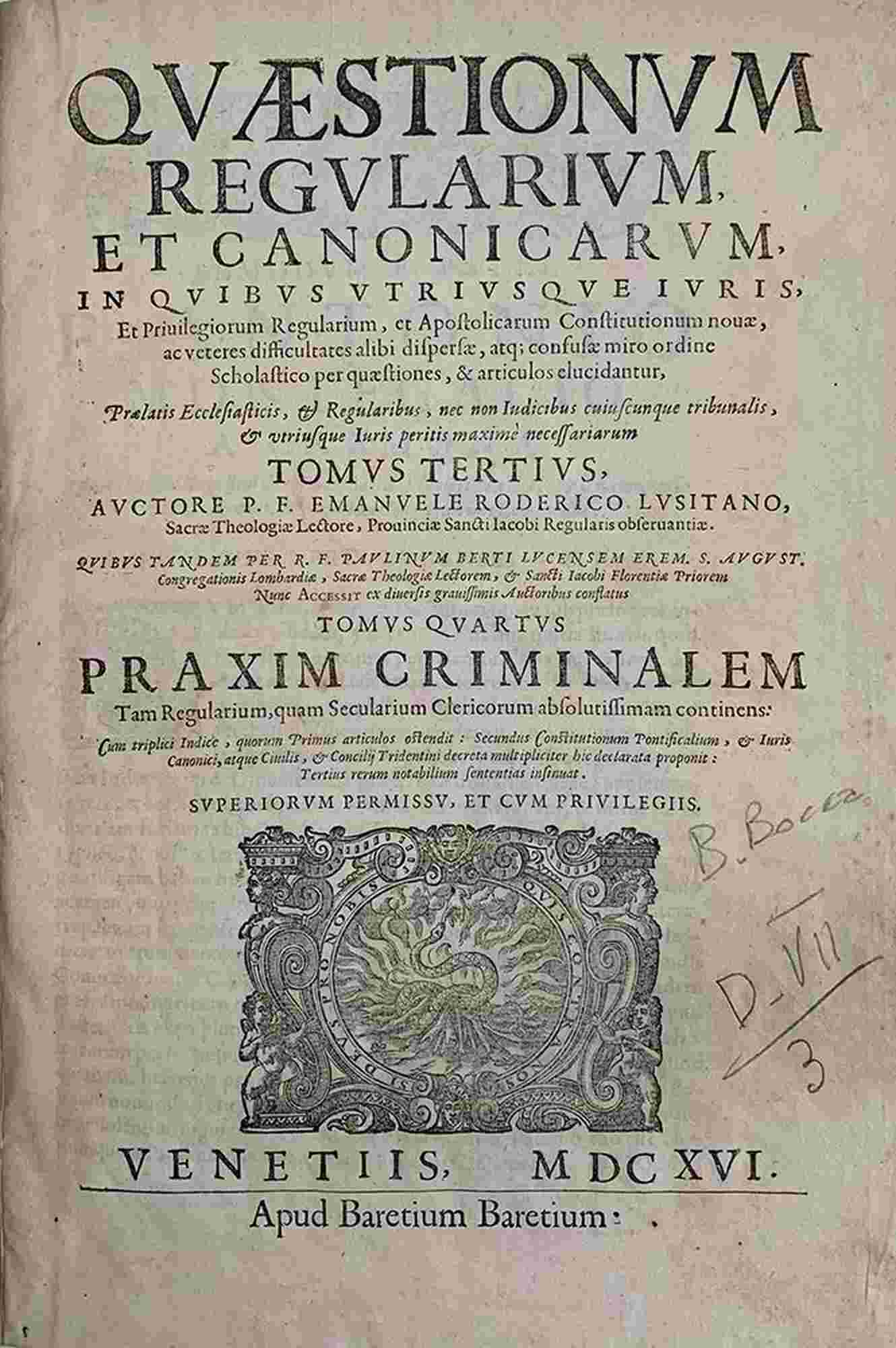 Lot 111 | EMANUEL RODERICUS: Quaestionum Regularium Et Canonicarum, Venezia, Apud Baretium De Baretiis, 1616