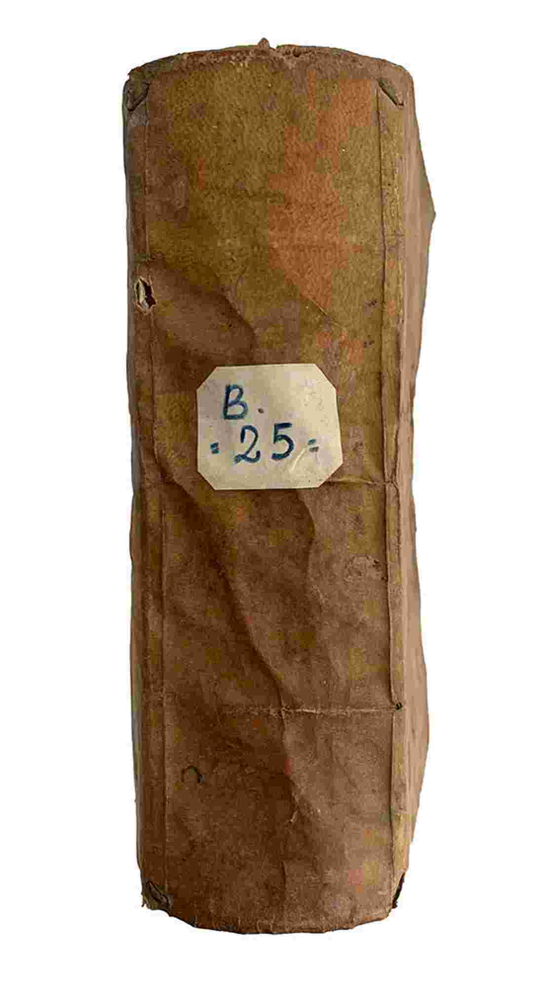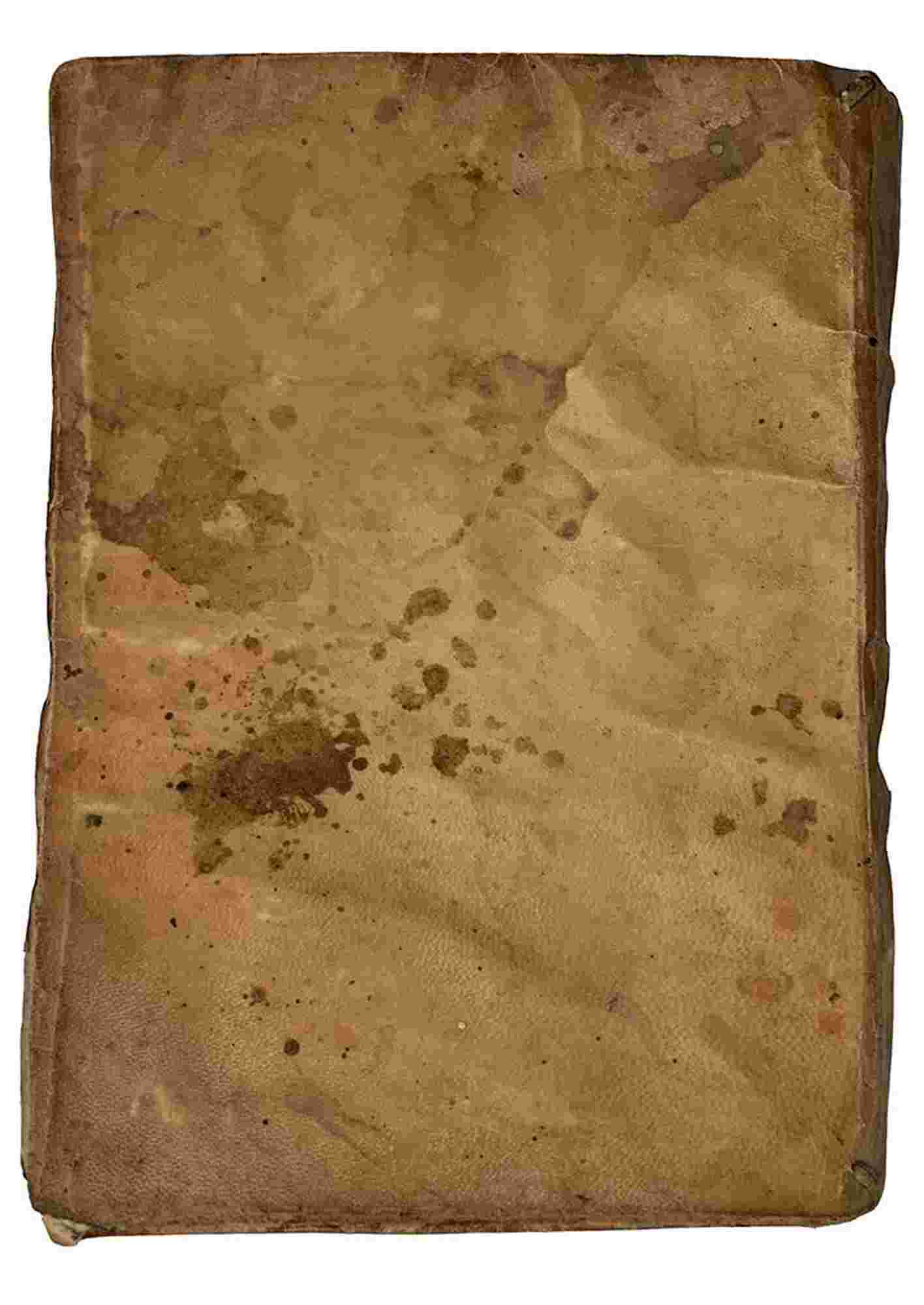Contemporary limp vellum, slightly disbound. A large water stain on the first pages. Worm hole on N quire.