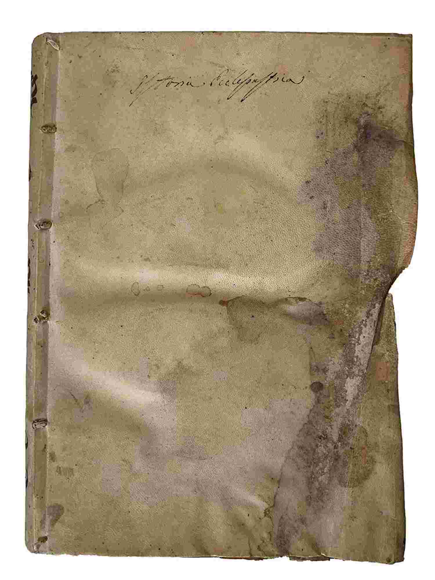 Contemporary limp vellum, handwritten title on spine, severely damaged copy, sold as it is.