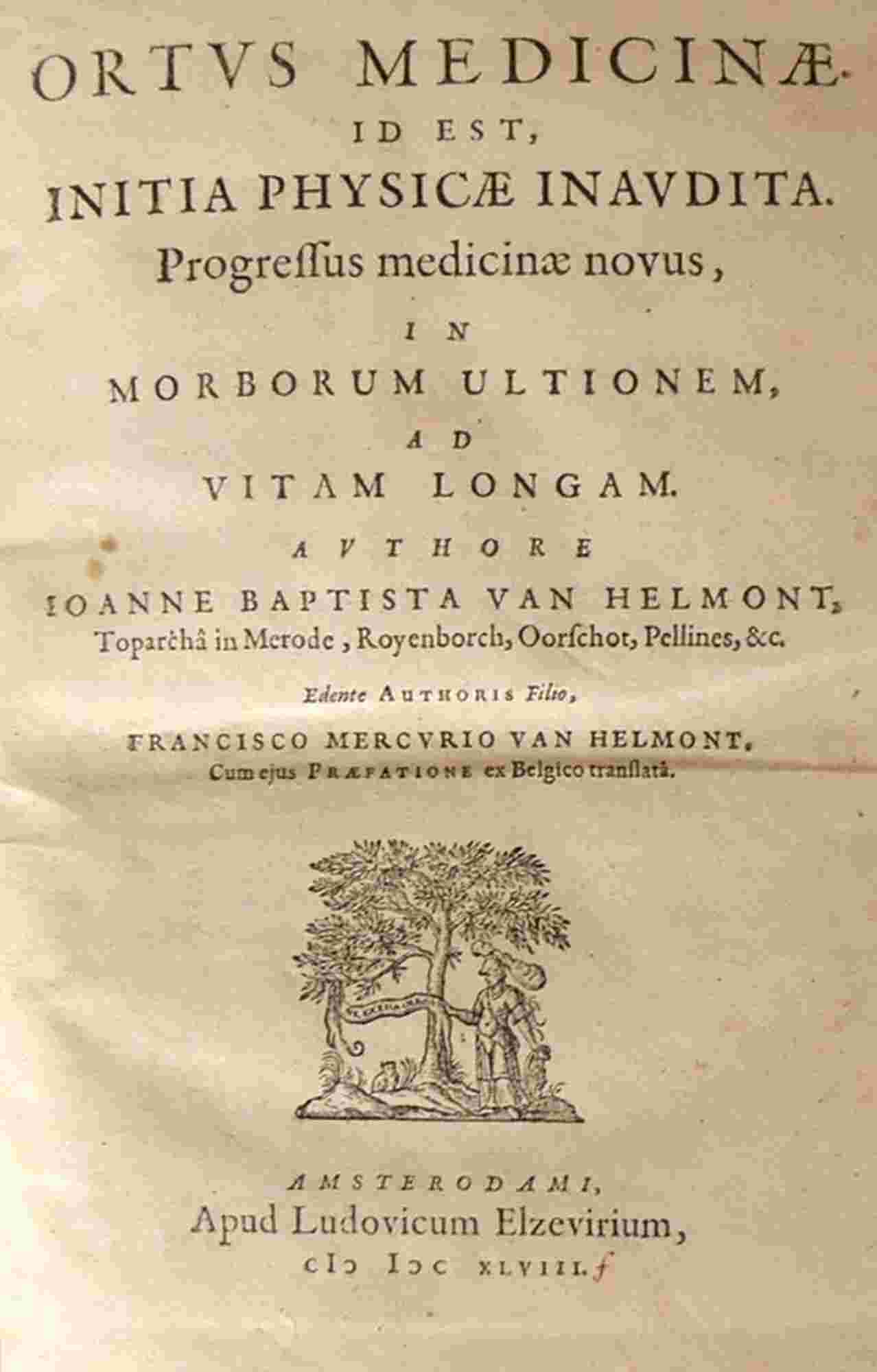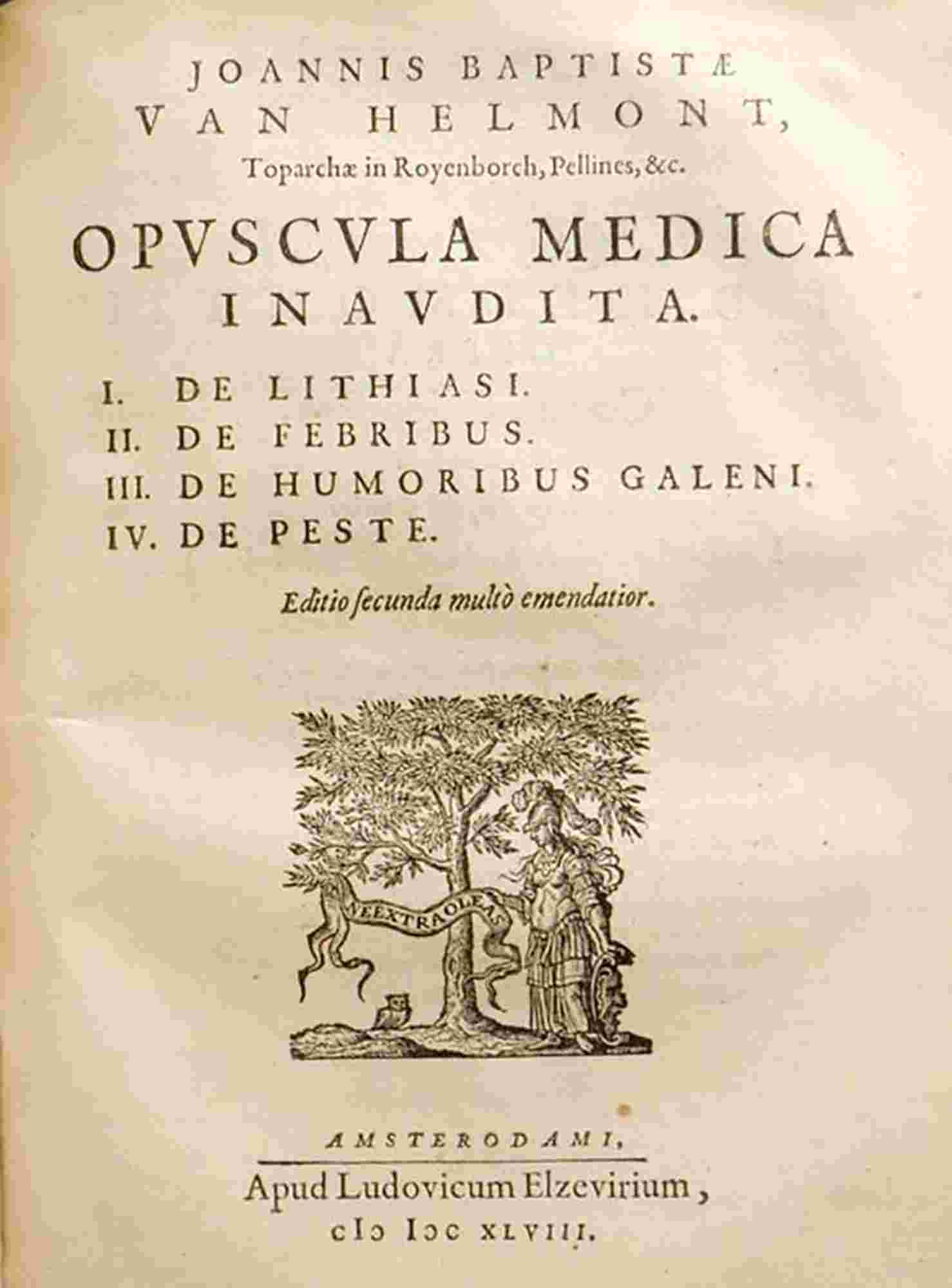 Ortus medicinae. Id est, Initia phisicae inaudita. Progressus medicinae novus, in morborum ultionem, ad vitam longam. Authore Ioanne Baptista van Helmont, Toparcha in Merode, Royenborch, Oorschot, Pellines, & c. Edente authoris filio, Francisco Mercurio van Helmont, cum eius praefatione ex belgico translata. [bound with:] Joannis Baptistae van Helmont, Toparchae in Royenborch, Pellines, & c. Opuscula medica inaudita. I. De lithiasi. II. De febribus. III. De humoribus Galeni. IV. De peste. Amsterodami, apud Ludovicum Elzevirium, 1648